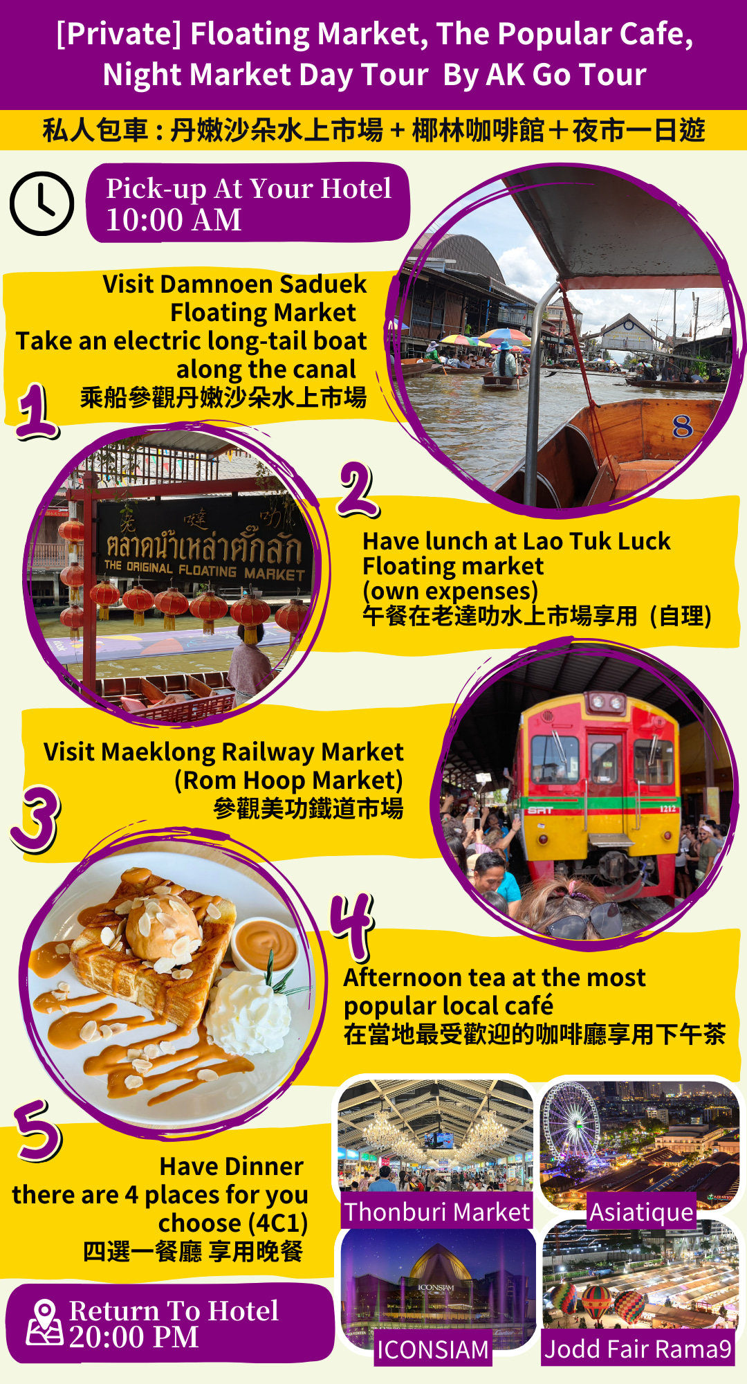 在丹能沙多水上市场享受难忘的购物冒险,在美功铁道市场与当地人讨价还价购买纪念品,并在 Asiatique 享受高档餐饮体验。丹能沙多水上市场是正宗的水上市场,您可以乘坐长尾船沿着运河游览,看看摊贩们提供的商品。美功铁道市场是另一个受欢迎的市场,每次火车经过时,摊贩们往往都急于收拾东西。Asiatique 是一个休闲的街头市场购物中心,位于唐人街南部。它拥有夜市中的一千多个精品摊位、街头小吃店、40 家餐厅和各种娱乐场所。您还将参观 Lao Tuk Luck 水上市场。这个旅游非常适合朋友和家人——包括孩子!