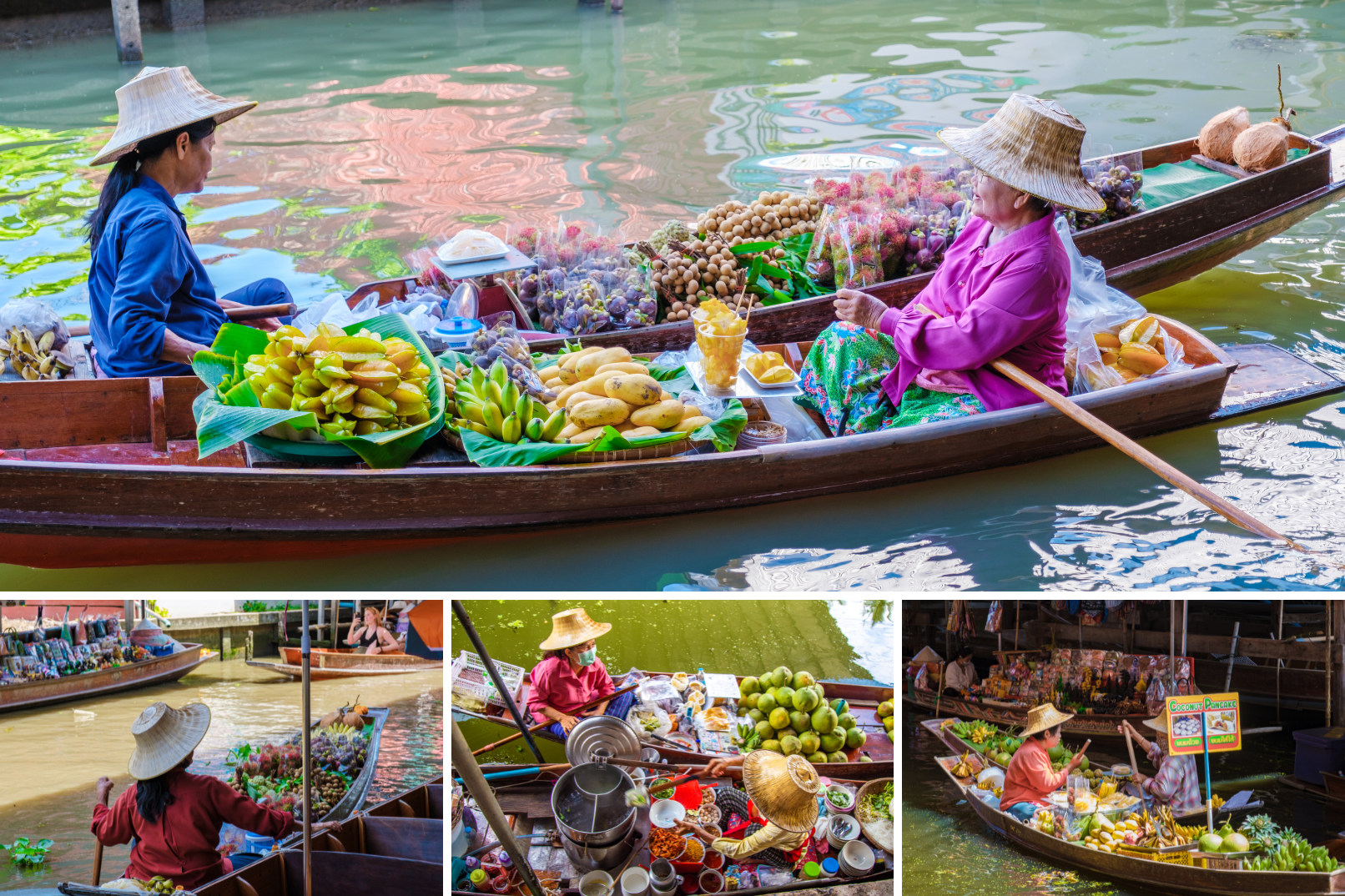 装饰着泰国美食的传统木船优雅地航行在熙熙攘攘的丹能沙多水上市场