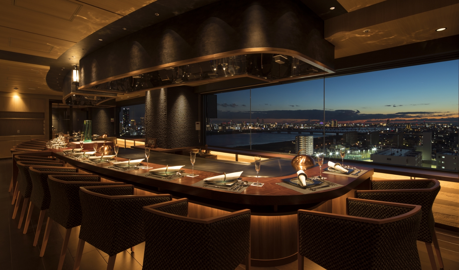 所有的座位都位于19楼,即饭店的顶层,在这里可以欣赏到大阪的全景夜景,也有包厢可供选择。