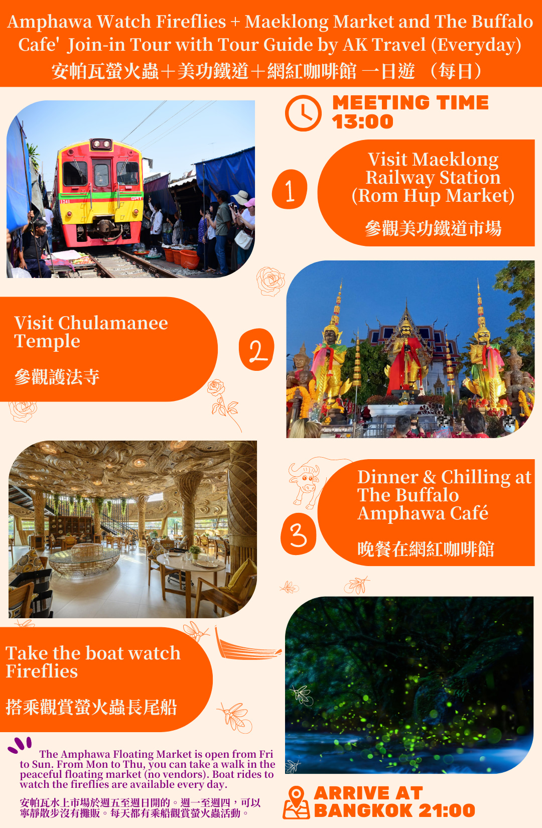 安帕瓦水上市场于周五至周日开放。周一至周四,您可以在宁静的水上市场散步(没有摊贩)。每天都有乘船观赏萤火虫的活动。
