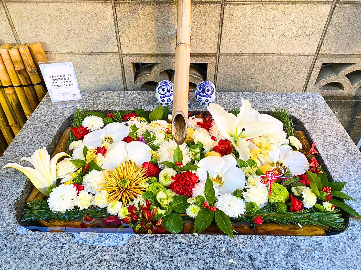 新年花长水——日本的一种传统习俗,在神社或寺庙的水盆中放置鲜花,取代通常的洗手仪式。