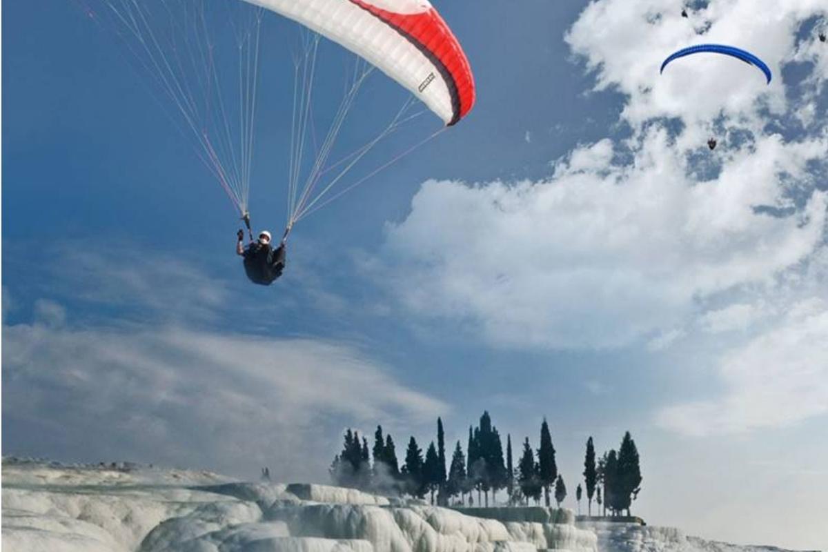 棉花堡是世界上为数不多的可以滑翔伞飞越如此独特地质构造的地方之一。准备和安全简报:飞行前,您将收到安全简报,并配备所有必要的设备。飞行:在滑翔于石灰华上时,享受飞行的感觉,并有充足的机会欣赏景色和拍照。着陆:经过激动人心的飞行后,您将安全着陆并有机会反思您的体验。无论您是肾上腺素瘾君子还是想从新的角度体验棉花堡,滑翔伞飞越石灰华都是一次难忘的冒险。日出时分,飞行时间最长可达 10 分钟。下午时分,飞行时间最长为 15 分钟。