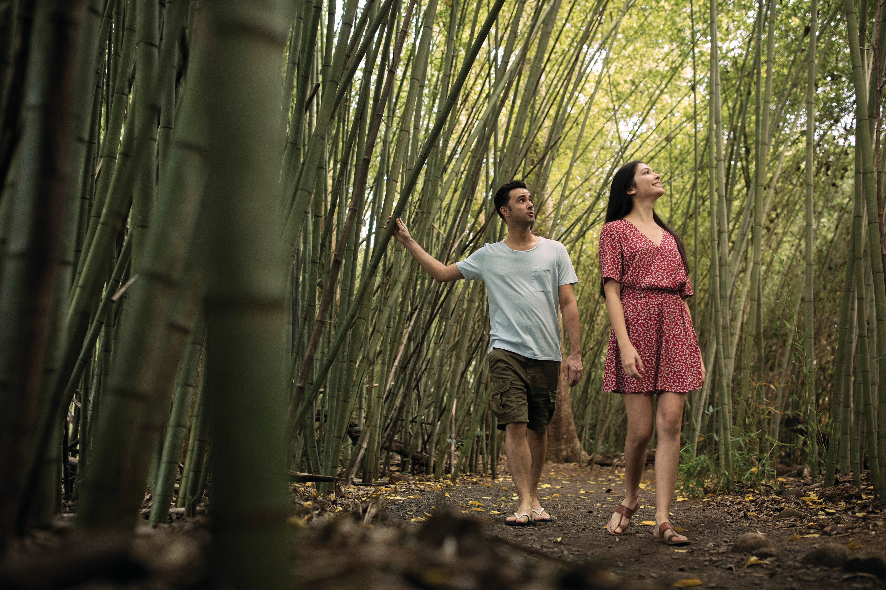 漫步在宁静的竹林步道上,周围环绕着郁郁葱葱的热带植物