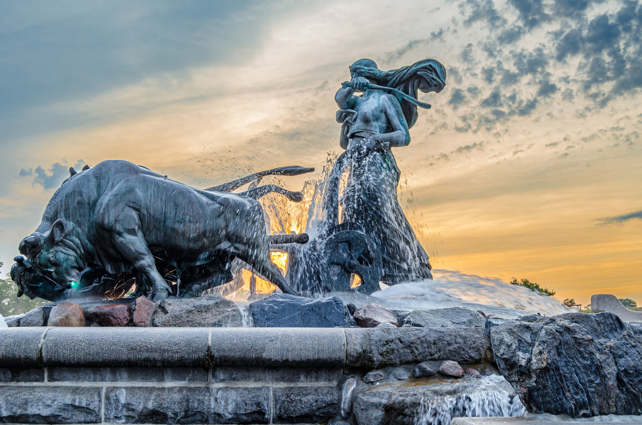 哥本哈根的吉菲恩喷泉:一个强大而雄伟的地标,描绘了挪威女神吉菲恩驱赶着她的牛,象征着西兰岛的诞生。