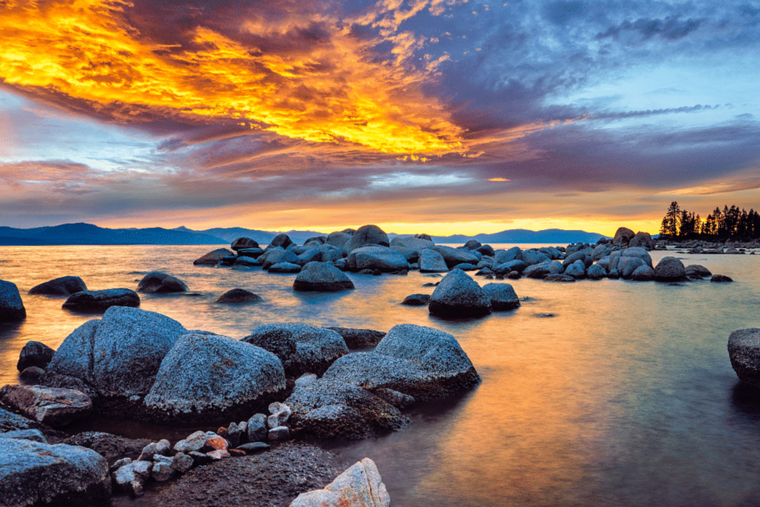 太浩湖在傍晚时分变幻莫测,平静的湖水在高耸的山脉映衬下倒映着落日的余晖
