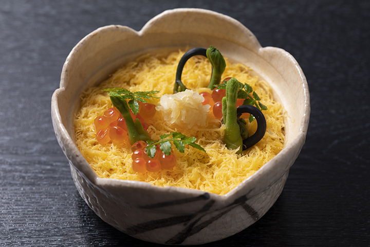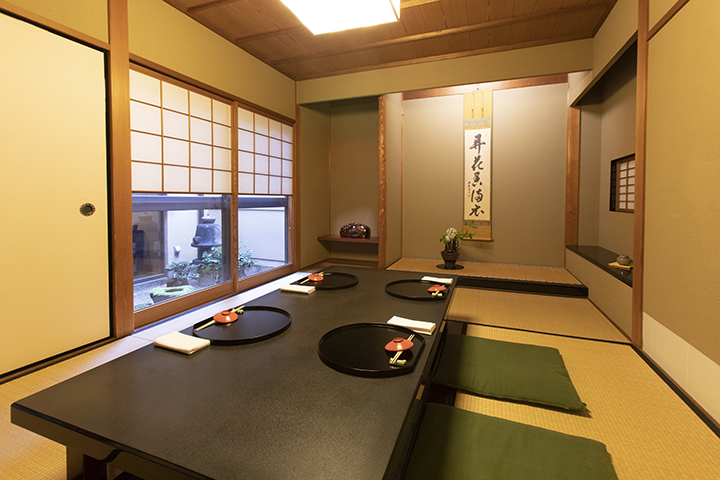 餐厅内有具有风情的京町屋的氛围,提供吧台、餐桌和榻榻米座位等不同的座位形式,配以卷轴画、生花和从人间国宝到现代艺术家的器皿,与美食相得益彰,营造出四季不同的“和风」氛围。