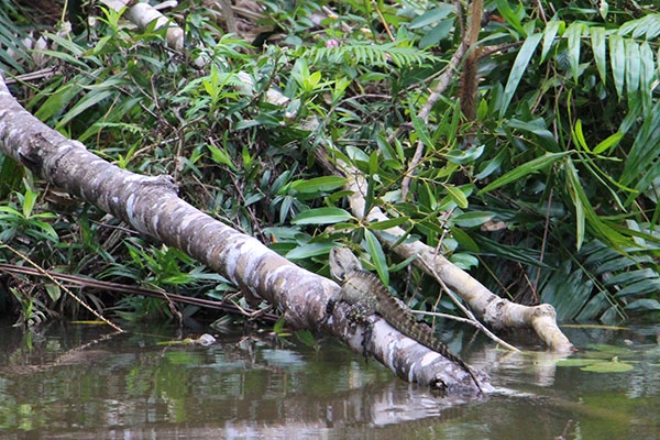 在生机勃勃的雨林中,发现在河岸边晒太阳的神秘水龙