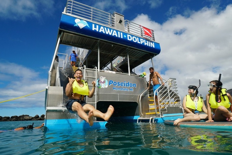 我们将沿着欧胡岛西海岸线航行寻找野生海豚,包括泛热带斑点海豚、宽吻海豚和飞旋海豚。之后,我们将前往马卡哈浮潜,与夏威夷海龟和热带鱼一起浮潜。享受免费午餐和热饮。试试我们的 21 英尺水滑梯、浮垫和桨板!在我们的 2023 年全美海洋双体船 Poseidon 上使用 ION 热水淋浴冲洗。这次适合家庭的冒险之旅将是值得纪念的一天。