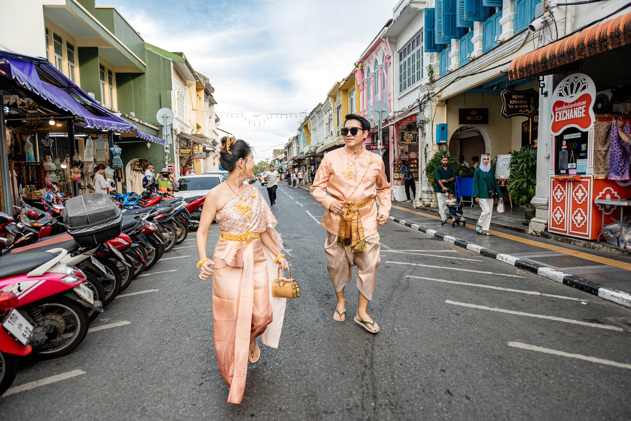 穿着由正宗泰国面料制成的豪华泰式服装,探索普吉岛老城区的著名寺庙和景点