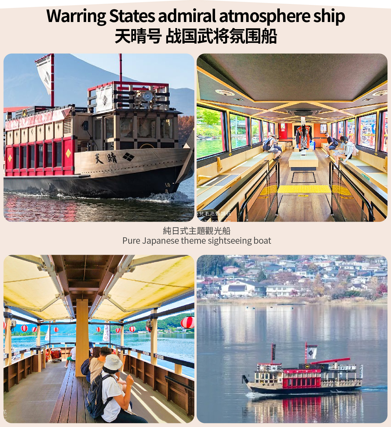 天气晴朗时,可以360度欣赏富士山的壮丽美景。宽敞的船上,设有50英寸的大显示器,即使在下雨天,也能了解到四季美丽的富士山和周边地区的历史和旅游信息。