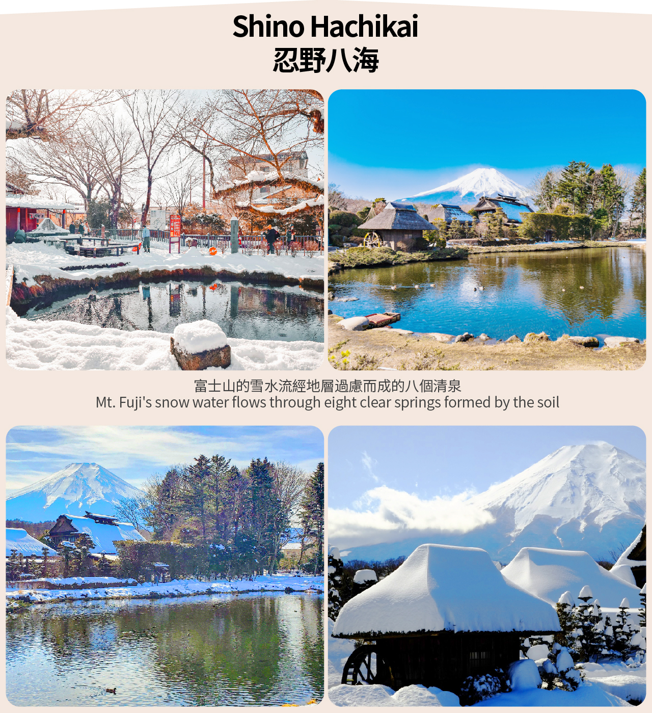 忍野八海以其优美的自然环境闻名,池水波光潾潾,与美丽的富士山合为一体,为国家指定的天然纪念物。
