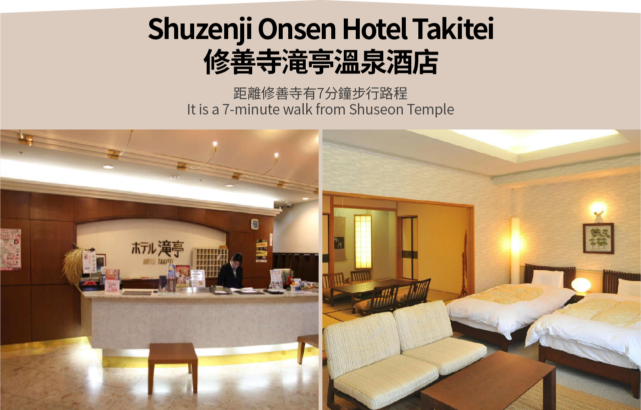入住修善寺滝亭温泉酒店,享受温泉。修善寺温泉街以其自然美景和文化背景闻名,是散步和放松的理想之地。