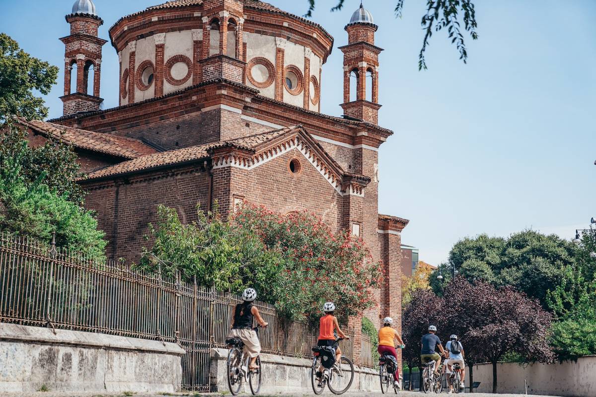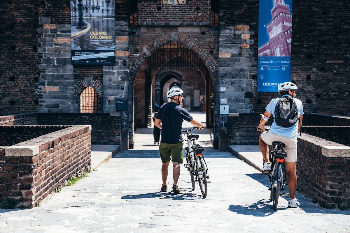 骑车经过标志性的斯福尔扎城堡,这是一座文艺复兴时期的堡垒,现在是艺术博物馆