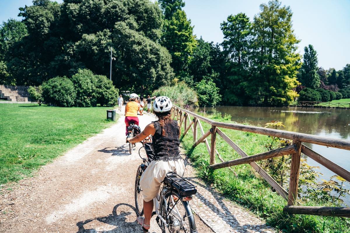 骑车穿过森皮奥内公园,这是米兰历史悠久的斯福尔扎城堡附近郁郁葱葱的绿洲