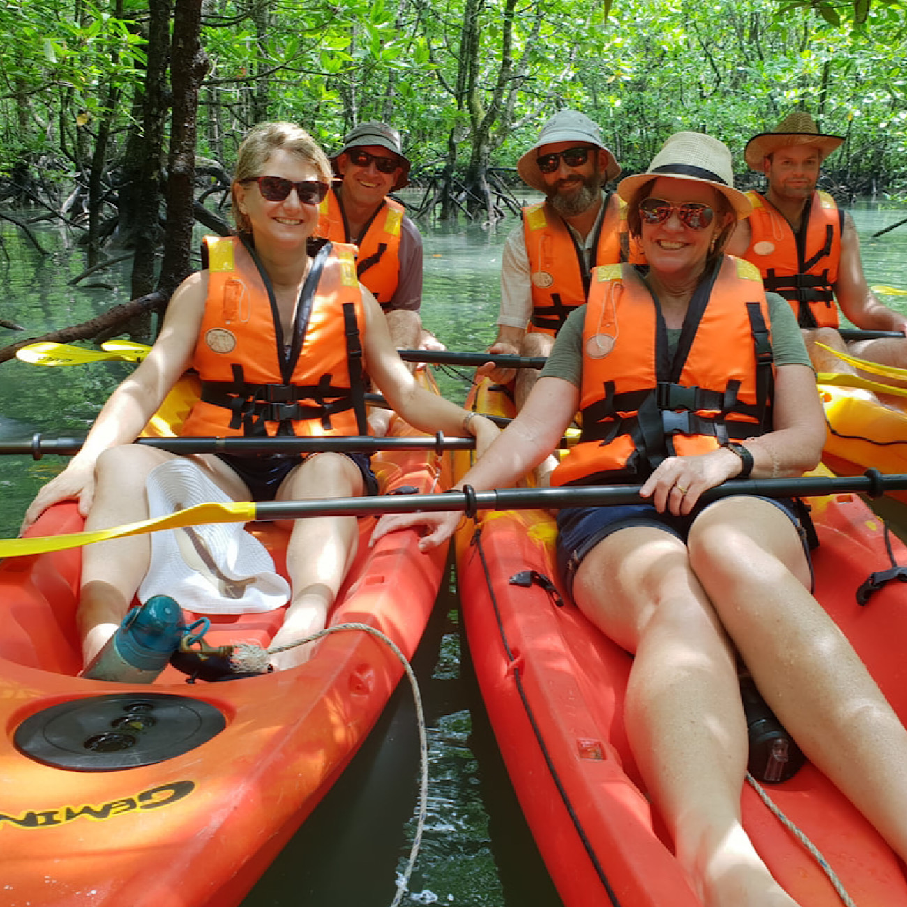 红树林是受保护的树木,充满了水生动物、虾、贝、蟹、鱼和许多其他动物。完整,阴凉,适合探险,学习,研究,环保,强体,空气新鲜,皮划艇是一项锻炼活动,看红树林里渔民的生活方式,养鱼,餐厅,安静,适合放松。