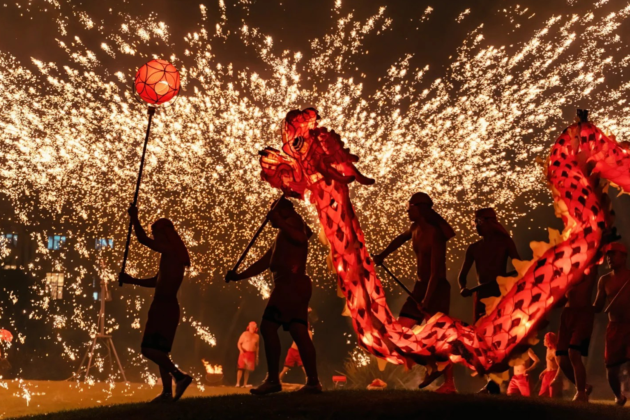 每逢春节,黄龙溪还举办打铁花的活动,同时,现场往往还伴有火龙灯舞等民俗表演,两条巨龙在火花中翻腾飞舞,呈现 “人在火中舞,龙在火中飞” 的震撼场景,将节日氛围推向高潮