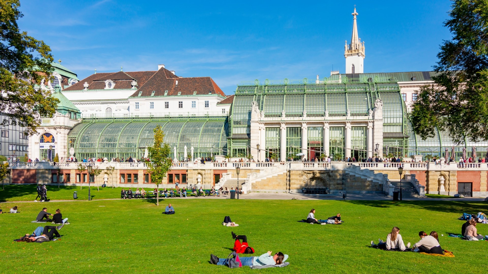 维也纳 Burggarten 阳光明媚的一天,游客在优雅的 Palmenhaus 温室附近放松身心