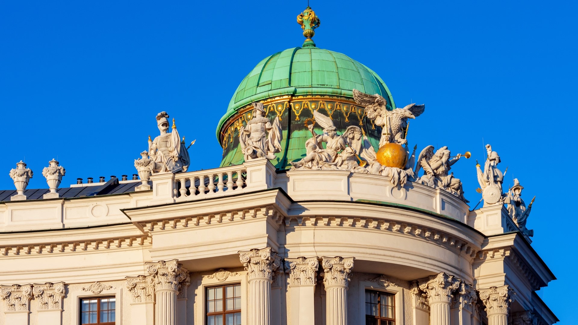 霍夫堡宫令人惊叹的建筑细节,以复杂的雕塑和充满活力的绿色圆顶为特色