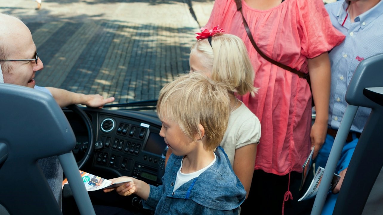 一家人登上赫尔辛基观光巴士,准备探索这座城市的地标