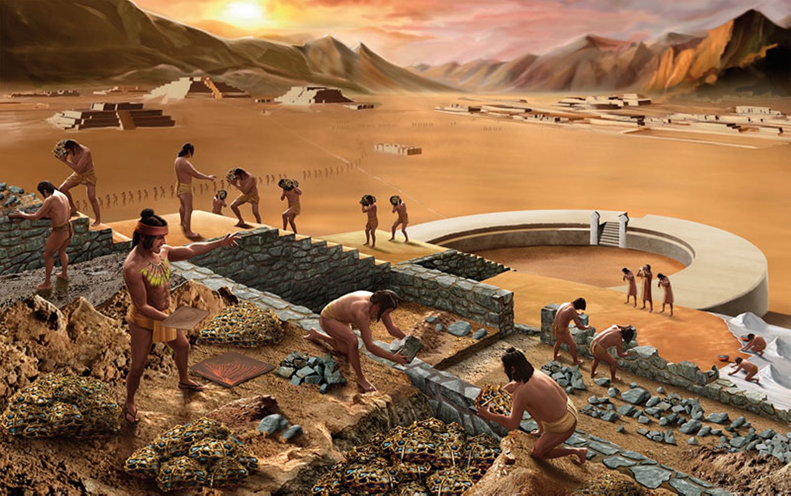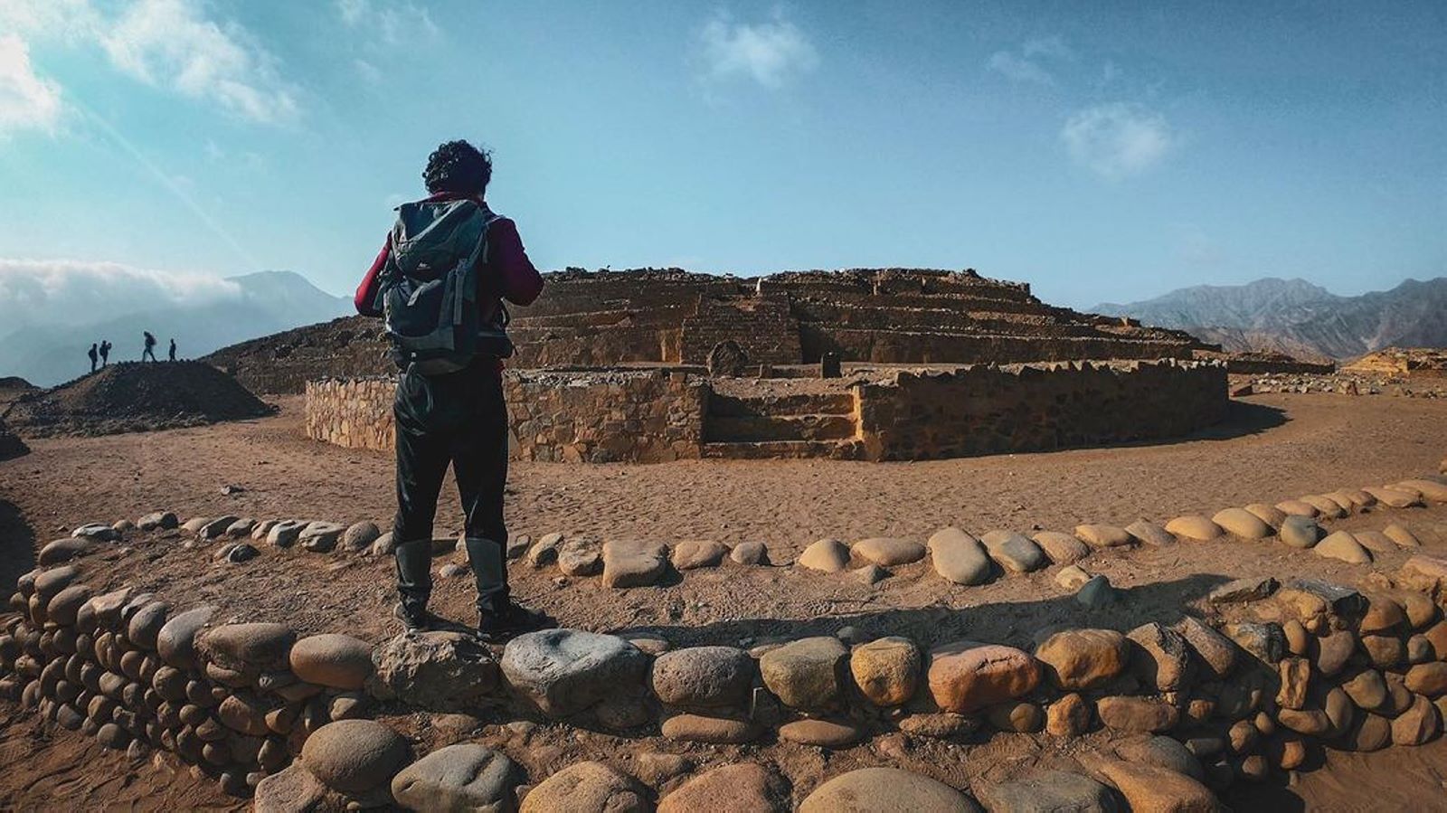 - 抵达卡拉尔城堡。被认为是“美国最古老的城市”,建于公元前 2,600 年的苏佩山谷。大约。 它是联合国教科文组织于2009年宣布的「美洲最古老的文明」和「人类文化遗产」。 。这座雄伟的考古建筑群坐落在干燥的沙漠高原上,俯瞰着苏佩河肥沃的山谷。它的扩建面积超过65公顷,您可以看到令人印象深刻的纪念性建筑,如大金字塔、圆形剧场神庙、画廊金字塔、坎特拉金字塔、万卡金字塔、小金字塔和圆形祭坛神庙。