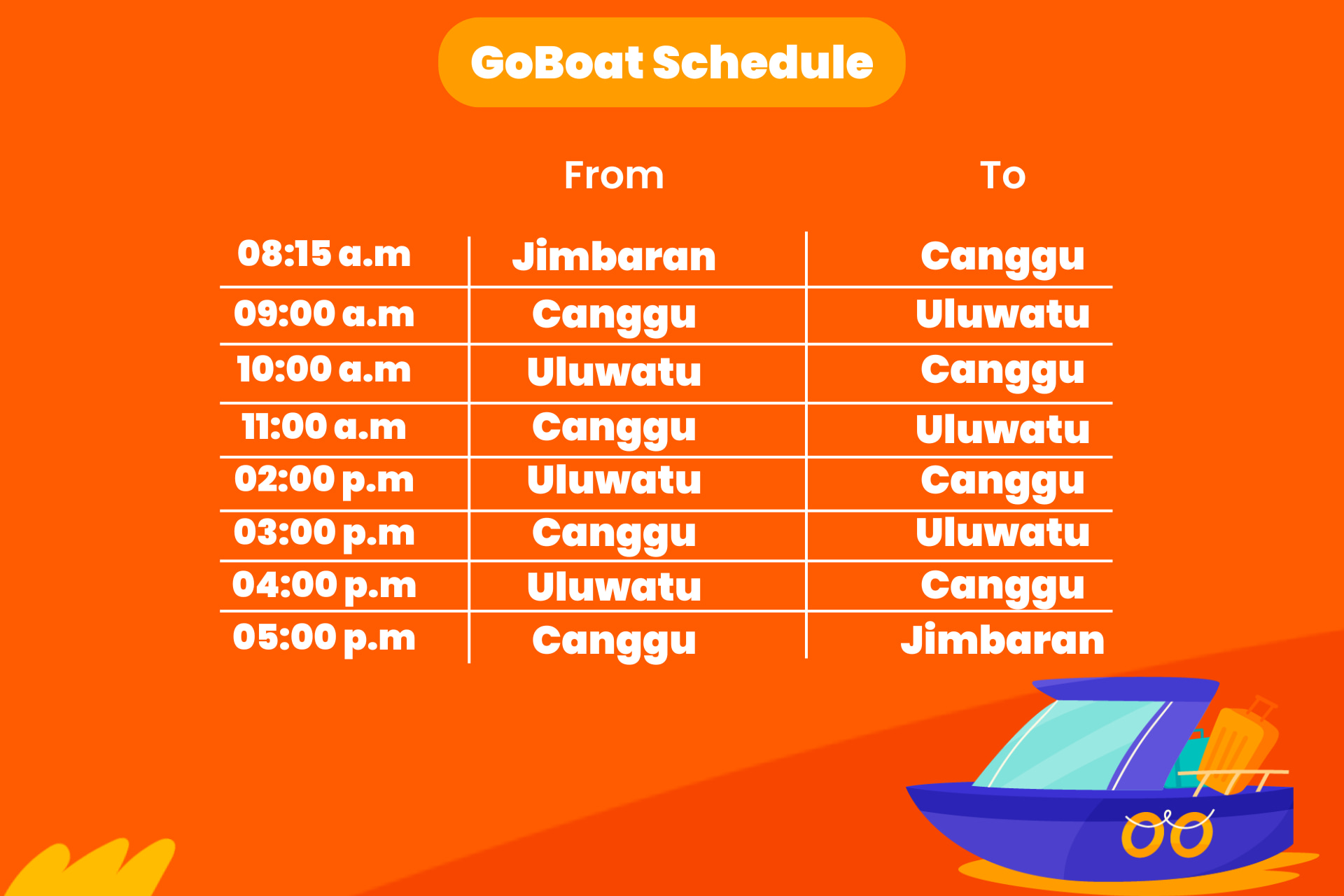 GoBoat 彰古 (Canggu)、乌鲁瓦图 (Uluwatu) 和金巴兰 (Jimbaran) 之间的交通船票