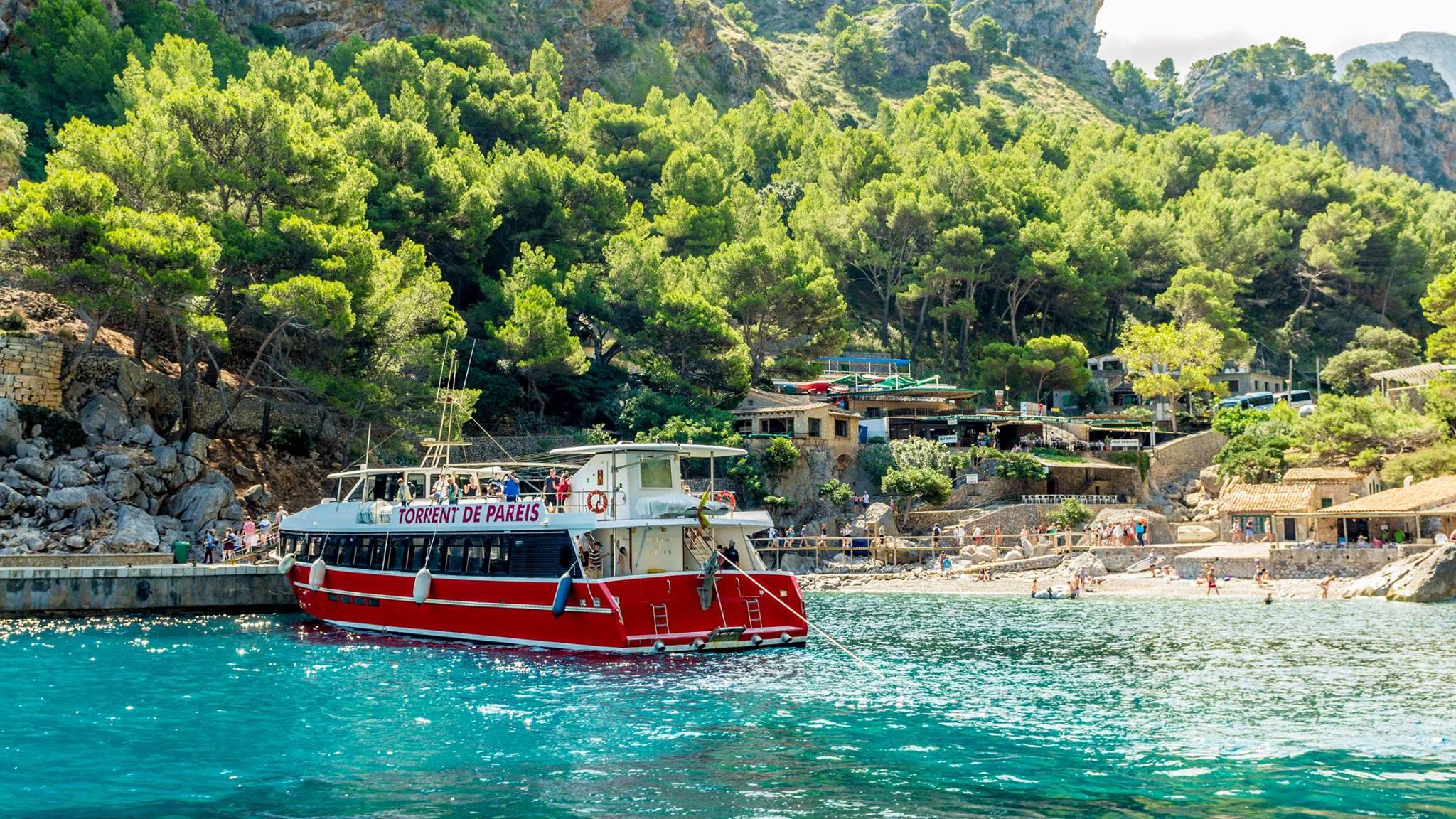 在 Sa Calobra,您可以自由探索宁静的风景和令人印象深刻的 Torrent de Paréis 峡谷,然后乘船沿着壮丽的海岸线航行 40 分钟到达索列尔港。