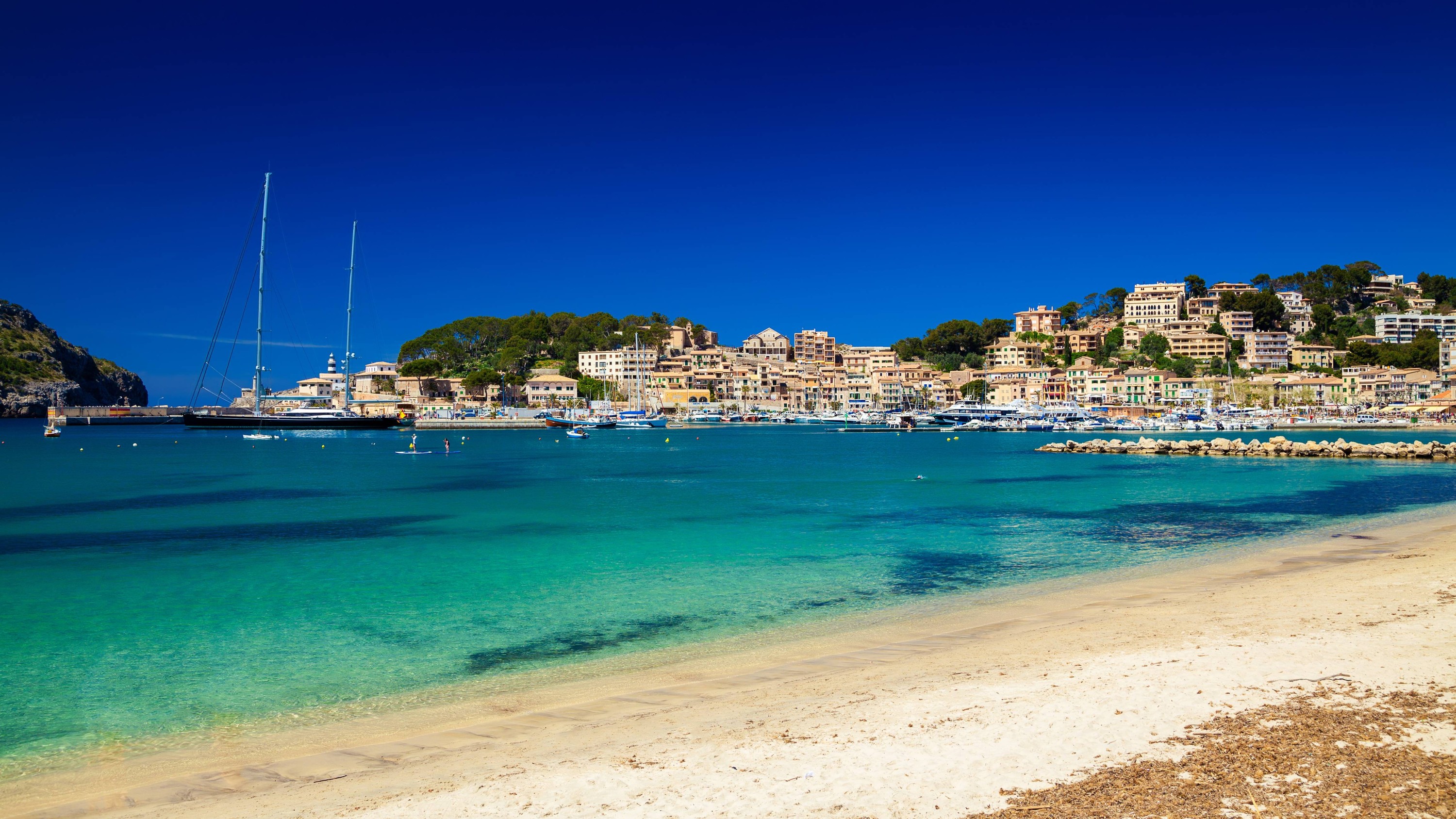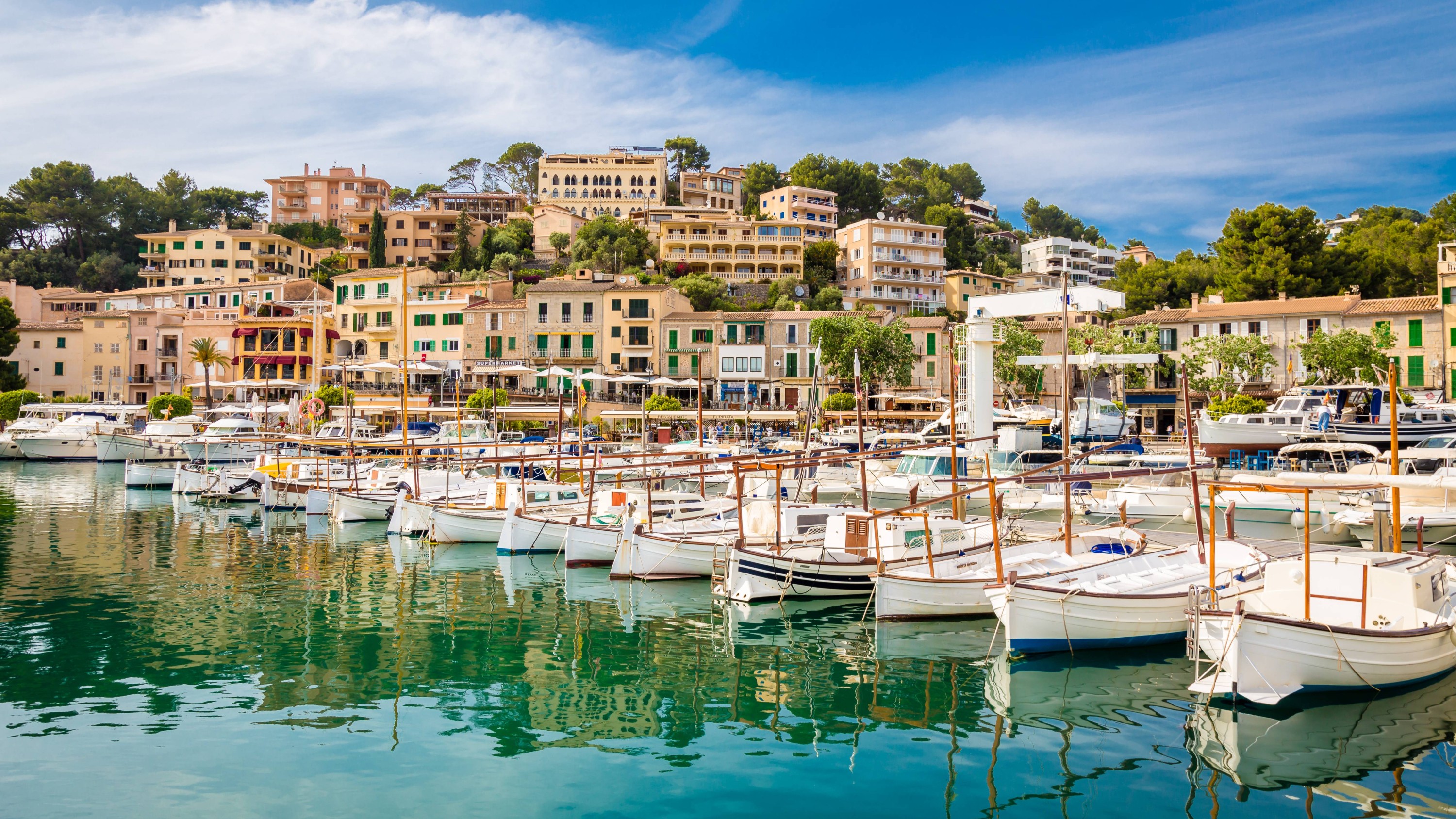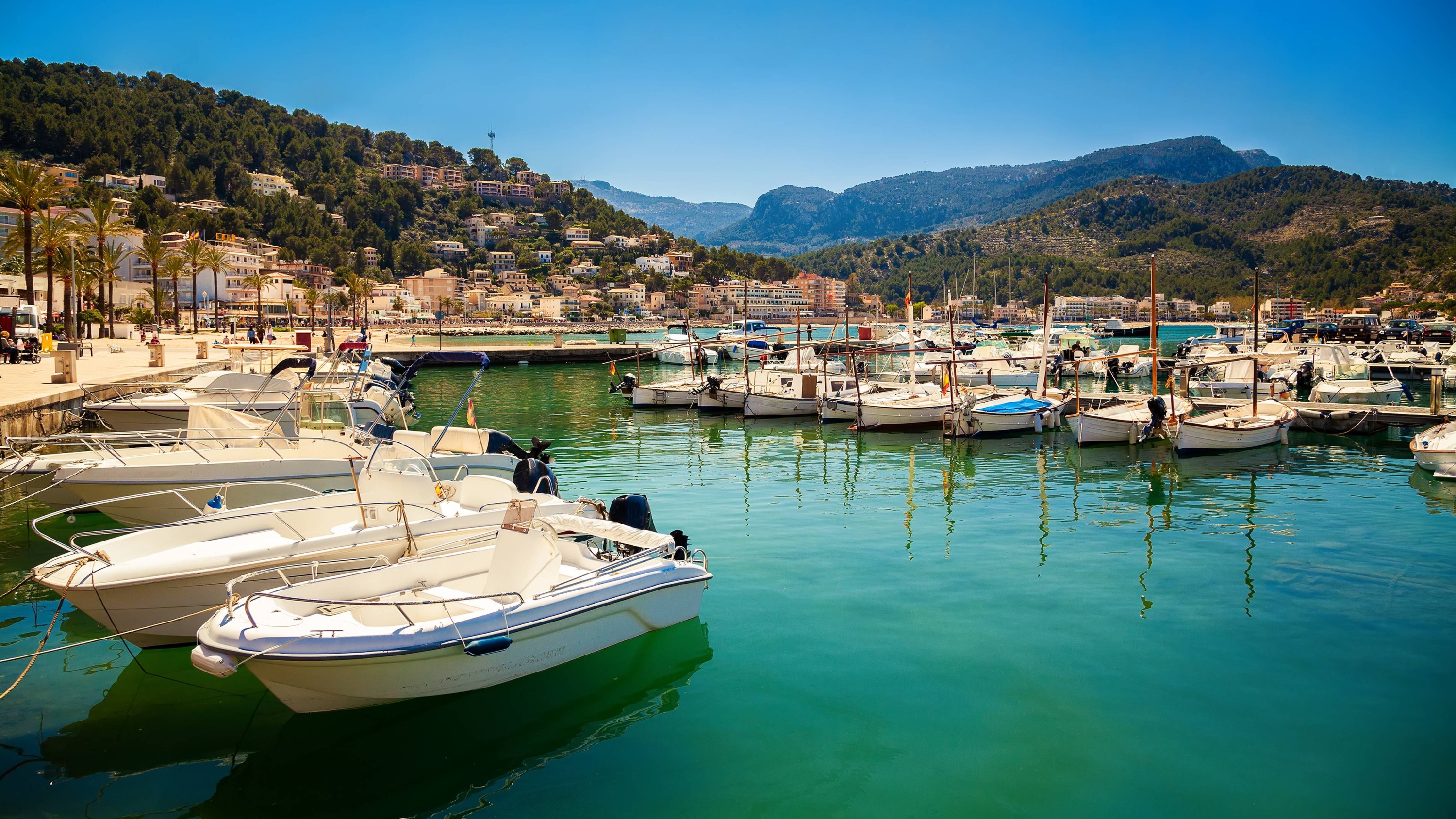 索列尔港平静的水面,倒映着船只和周围的群山
