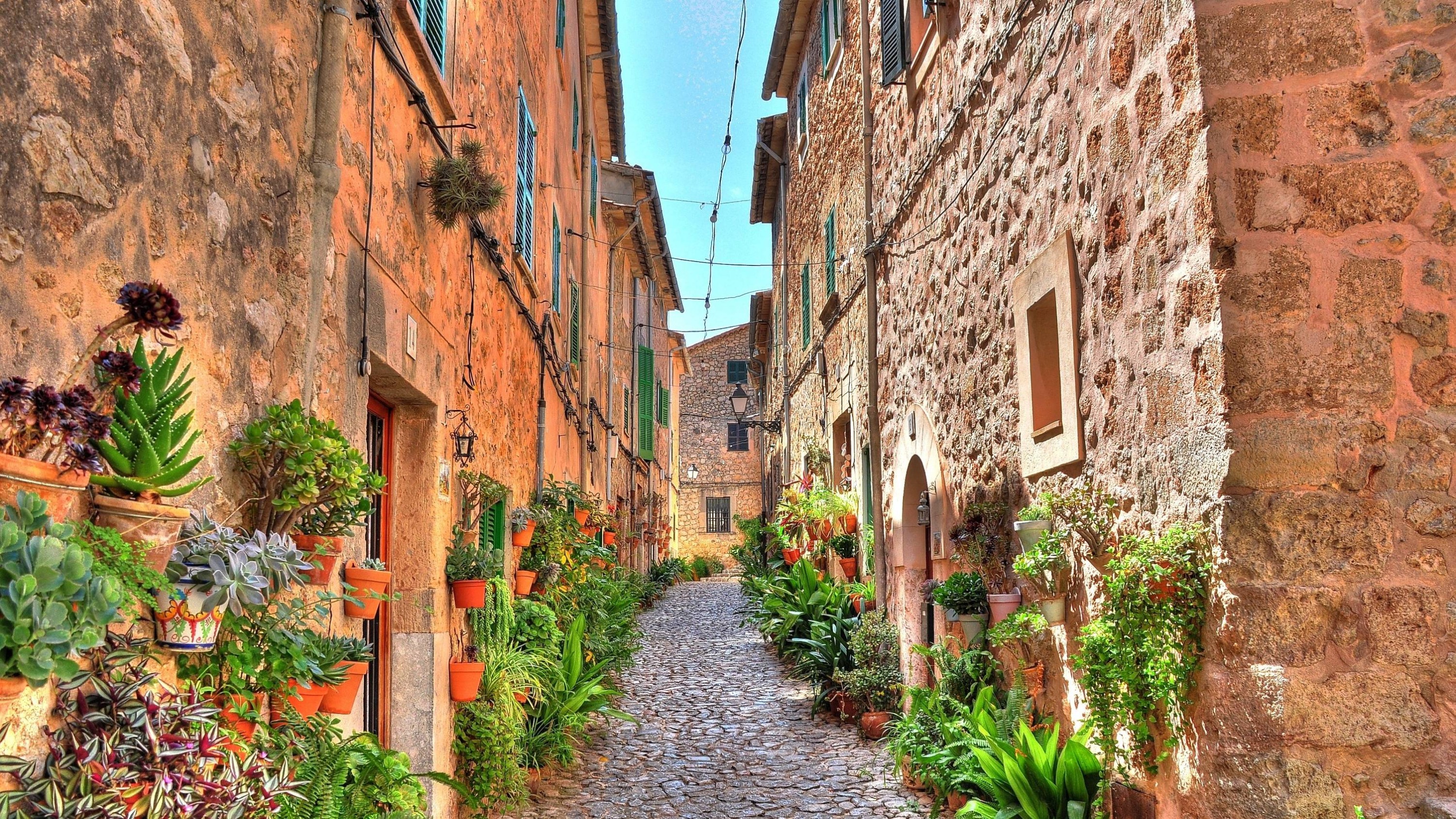 瓦尔德莫萨的一条迷人街道,有鹅卵石小路和门边五颜六色的盆栽