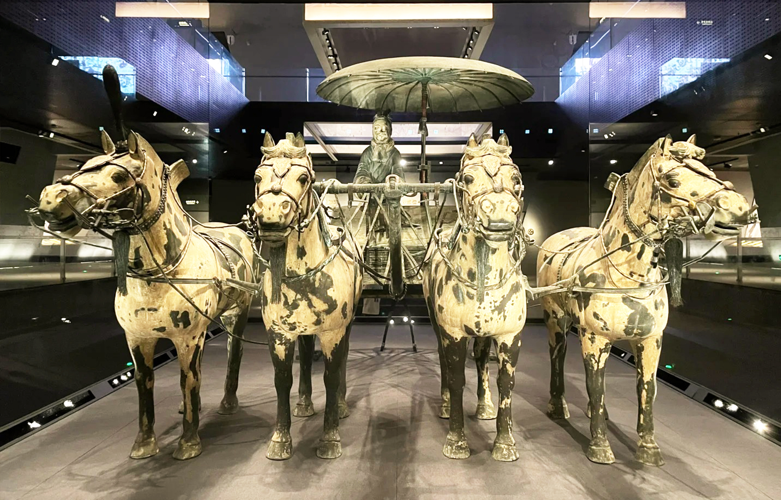 两乘铜车马比例精确,造型生动,形态各异,正是秦代艺术家们精湛的工艺水平赋予了冰冷的青铜无限的生命力