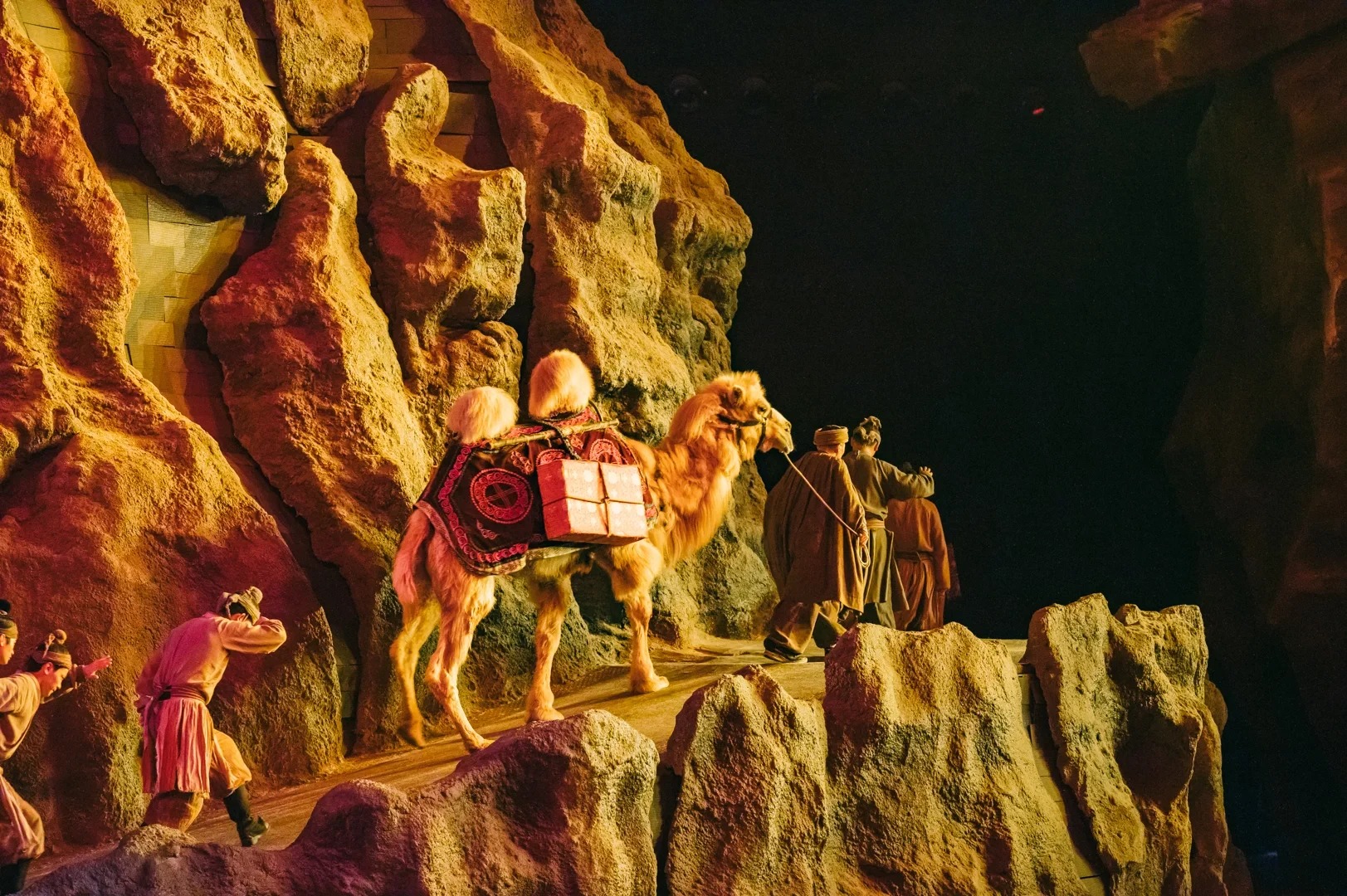 《驼铃秀》演出以 “一带一路” 为背景,挖掘大唐传统文化,讲述丝路驼队故事。序幕《岁月再现》将观众带回丝绸之路起点长安
