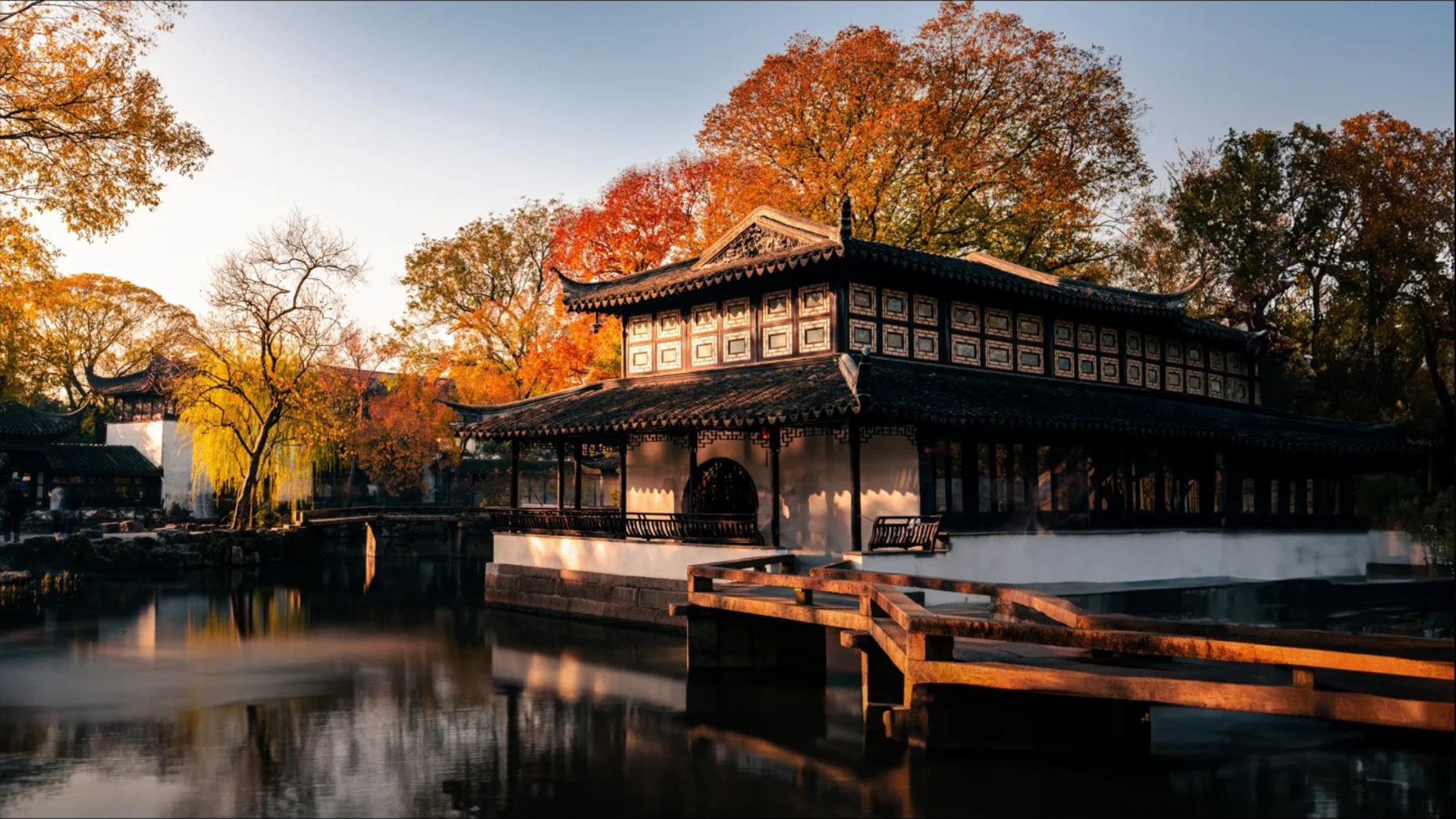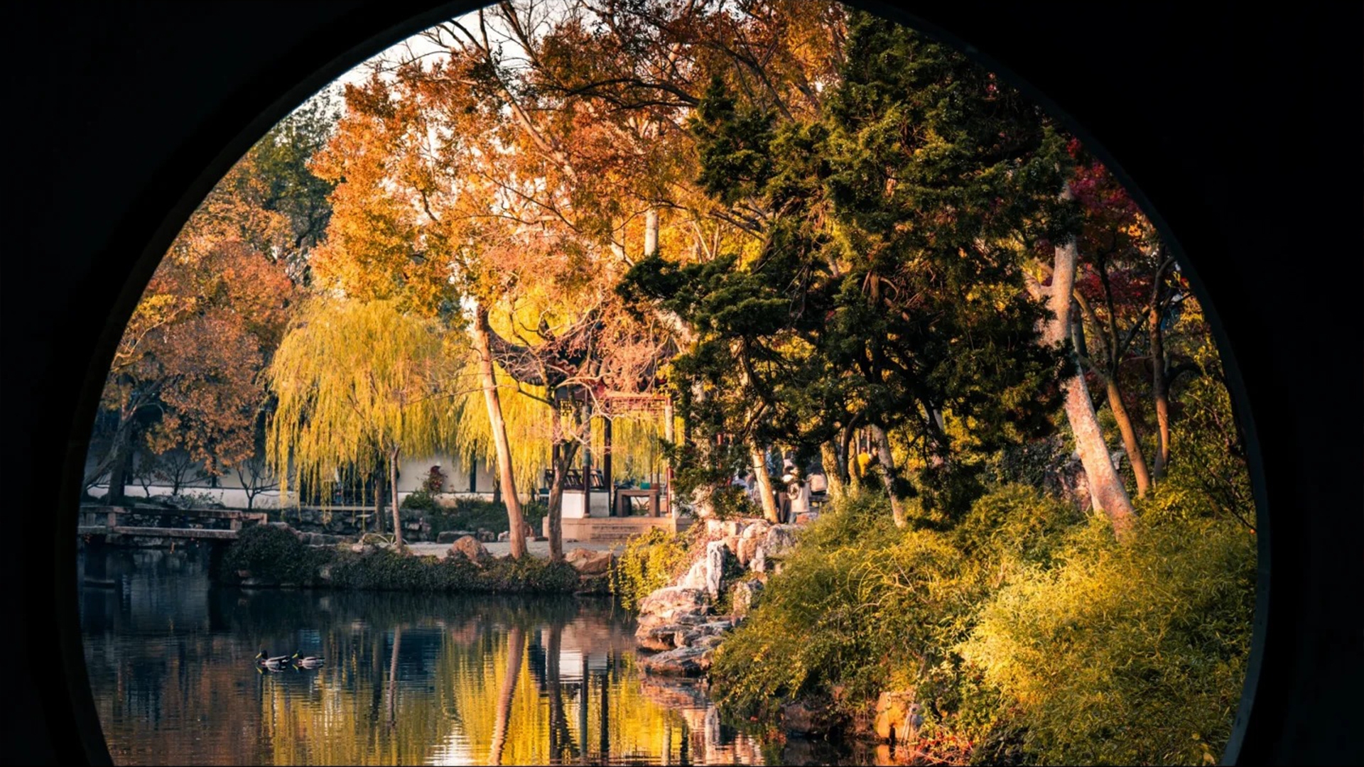 秋季的金黄,也有常绿树木的翠绿,亭台古朴典雅,体现了江南园林的精致与灵动,展现了园林景观在不同季节的独特韵味和空间美感