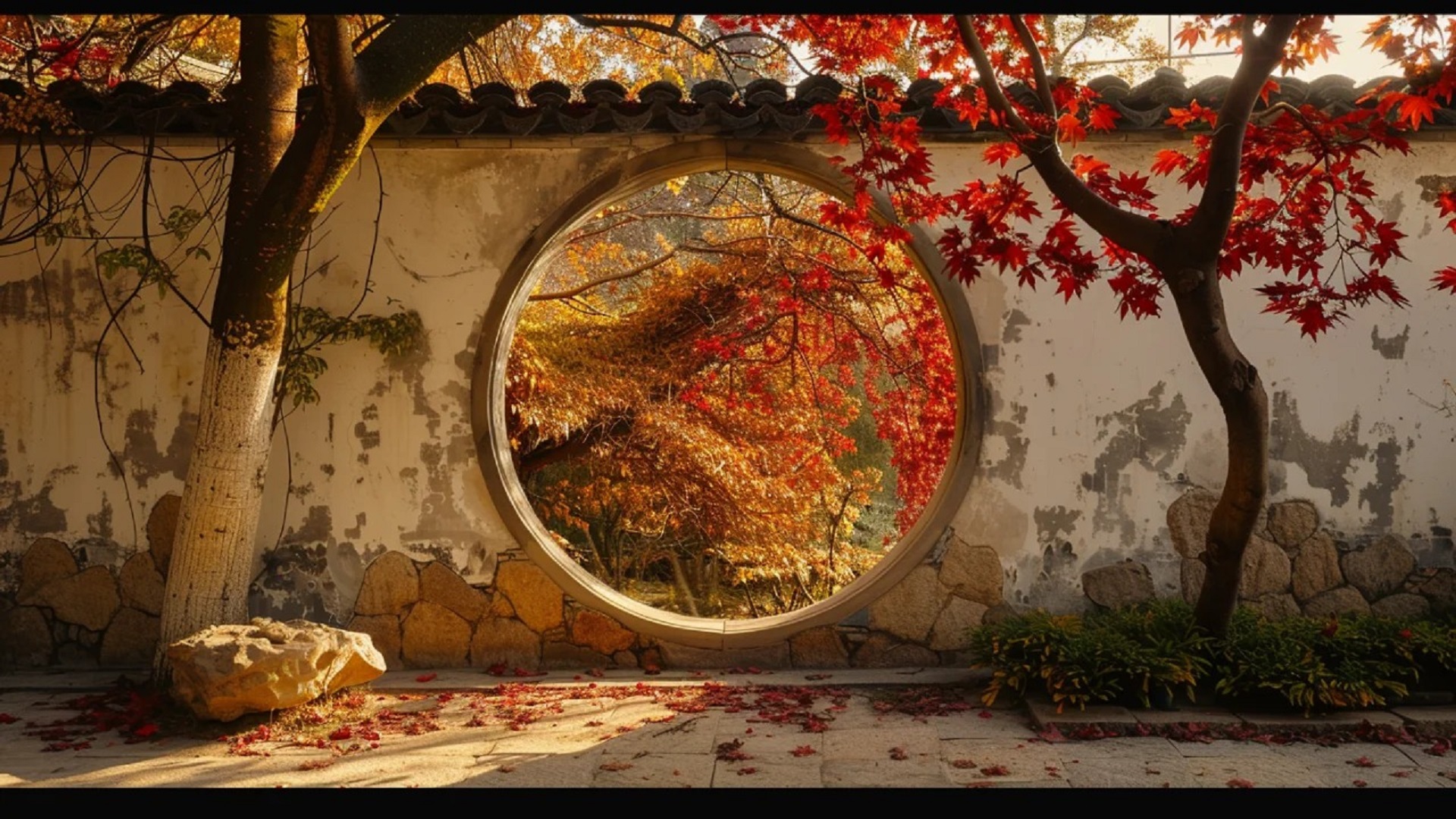 式园林的独特景致与秋意之美。画面中心是一堵斑驳的白墙,墙体下部由石块砌成,墙中嵌着经典的圆形月洞门。月洞门似天然画框,框住门外秋色,透过它能看到色彩斑斓的树木,叶片呈现出橙红、金黄等暖色调,显示出秋天独有的绚烂