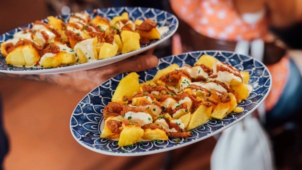 酥脆的西班牙辣味土豆配上辣酱和奶油蛋黄酱,是巴塞罗那的一道佳肴