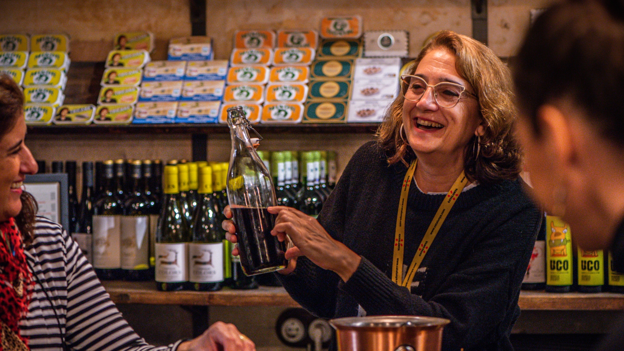 这位女士高兴地品尝葡萄酒,并与好奇的顾客分享她的知识和热情