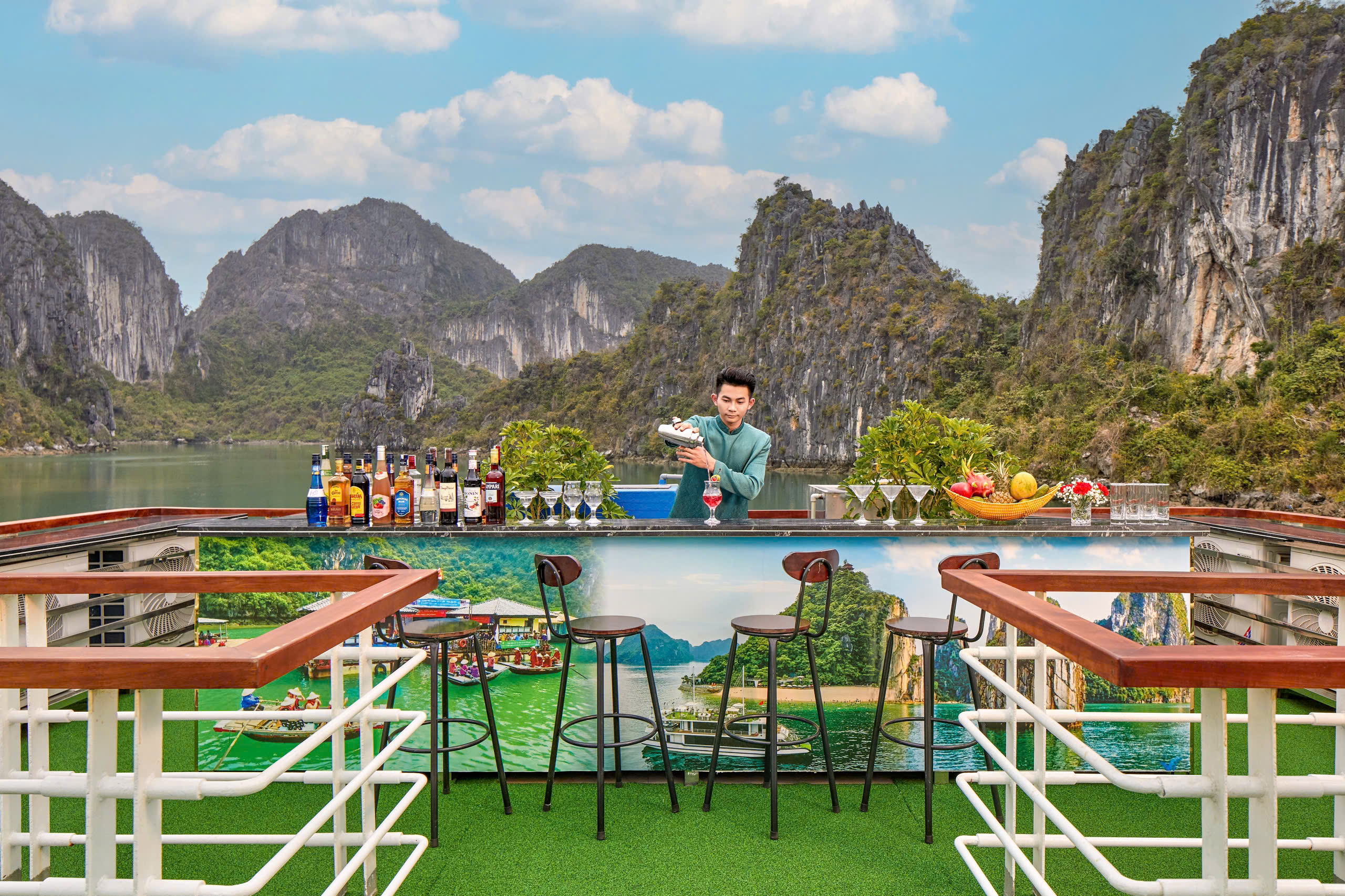 在船上享用正宗越南特色自助午餐,同时欣赏全景海景