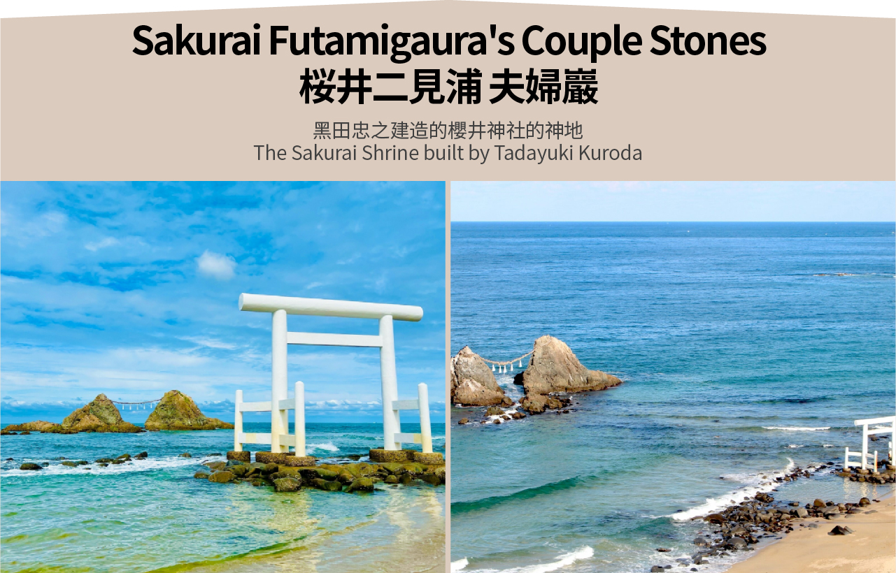 桜井二見浦,以其独特的白色鸟居和夫妇岩而闻名。白色鸟居伫立于海面之上,与碧海蓝天形成一幅宁静而充满神性的画面。在白色鸟居的身后,是被称为“夫妇岩”的两块岩石,象征着美好的姻缘和夫妇美满。