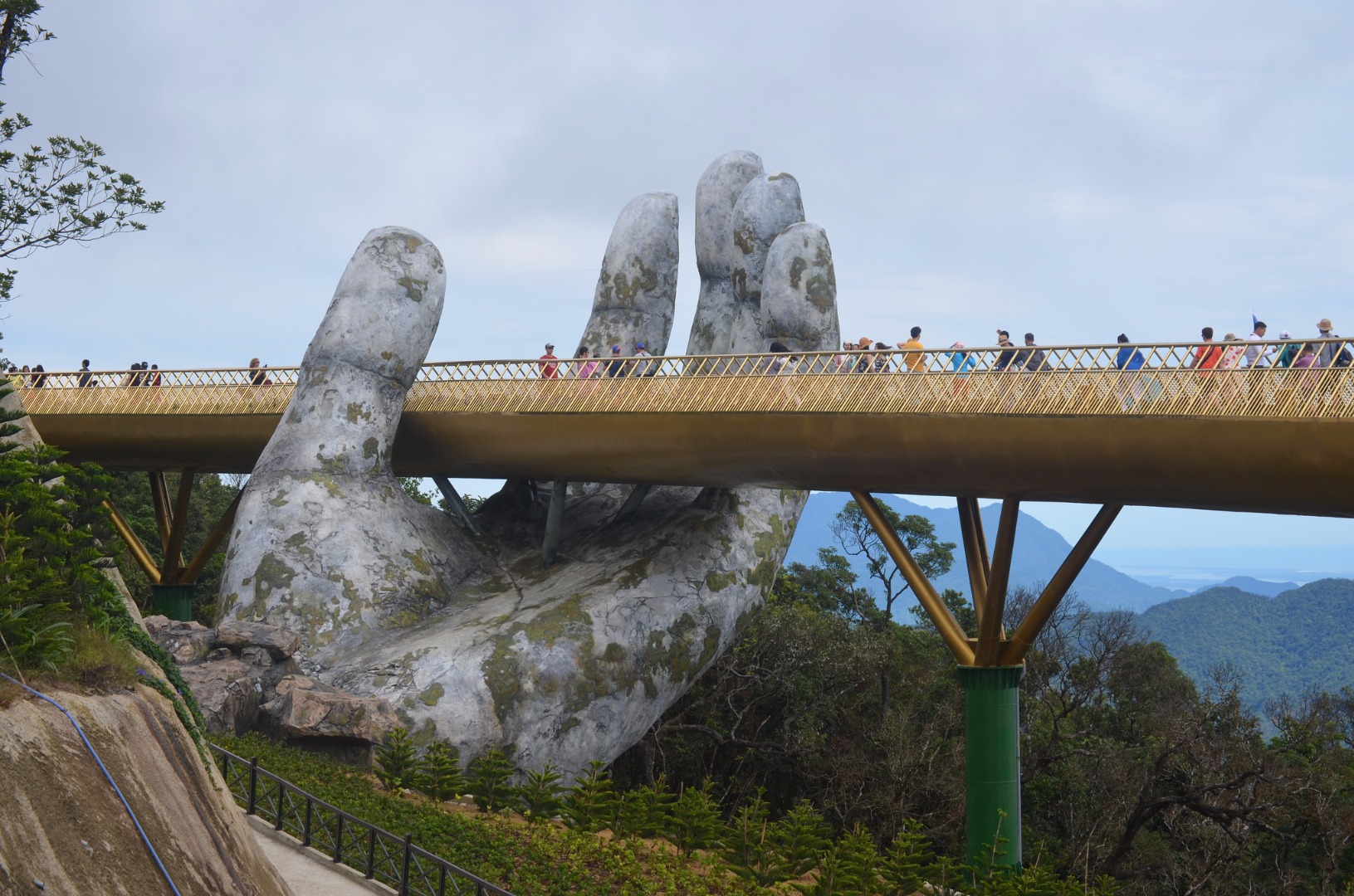 参观巴拿山里的独特景观「佛手桥」,巨手将形如缎带的金桥托在半空中