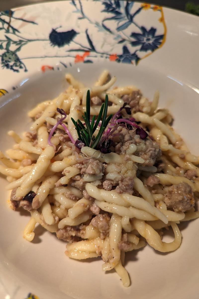 托斯卡纳面食午餐(来自皮恩扎的当地腌肉和我们邻居的 Pecorino di Pienza 起司品尝、自制第一道菜、甜点、水和咖啡)。酒不包括在内。