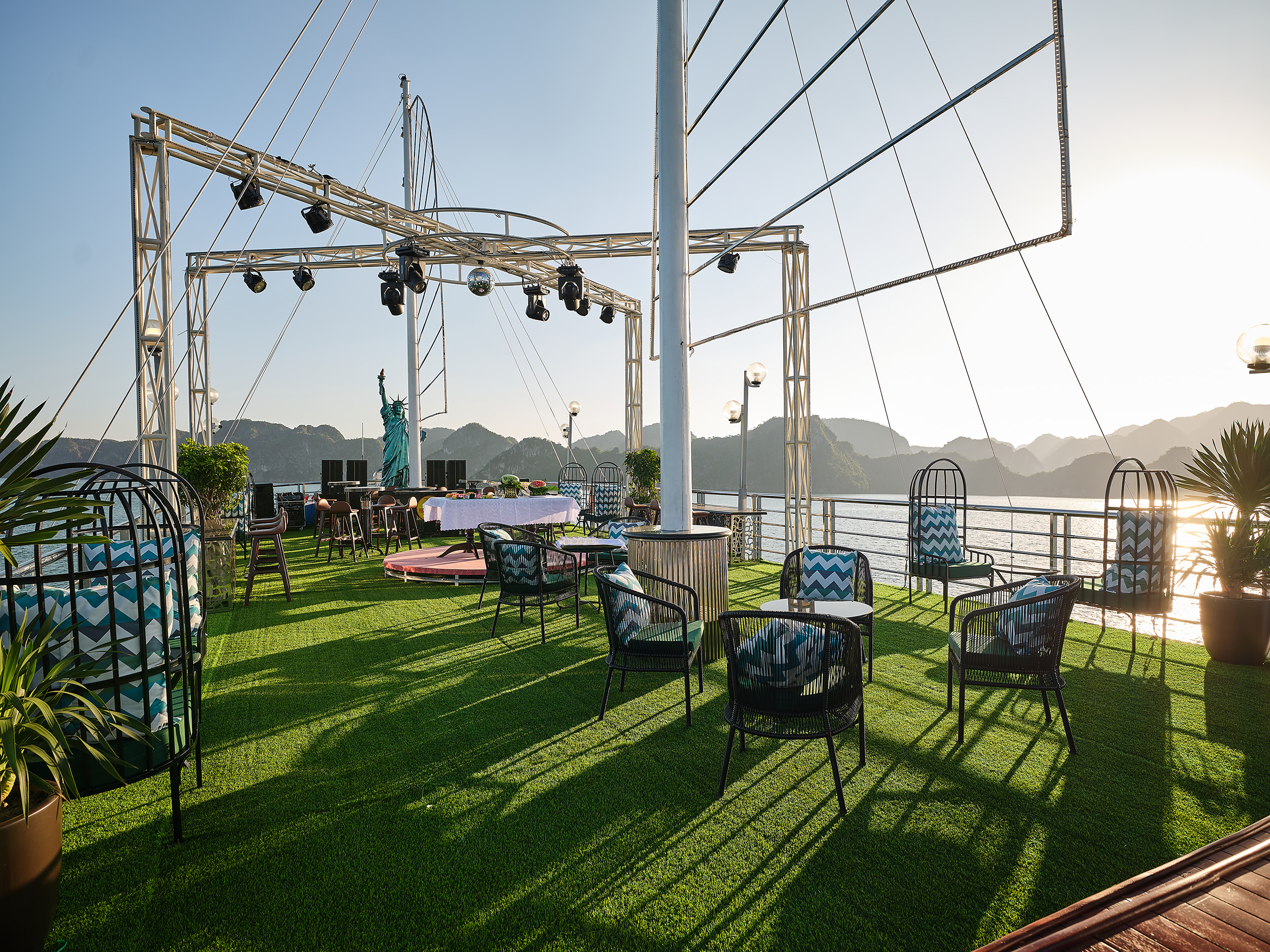 在游轮的日光浴平台上放松并拍照