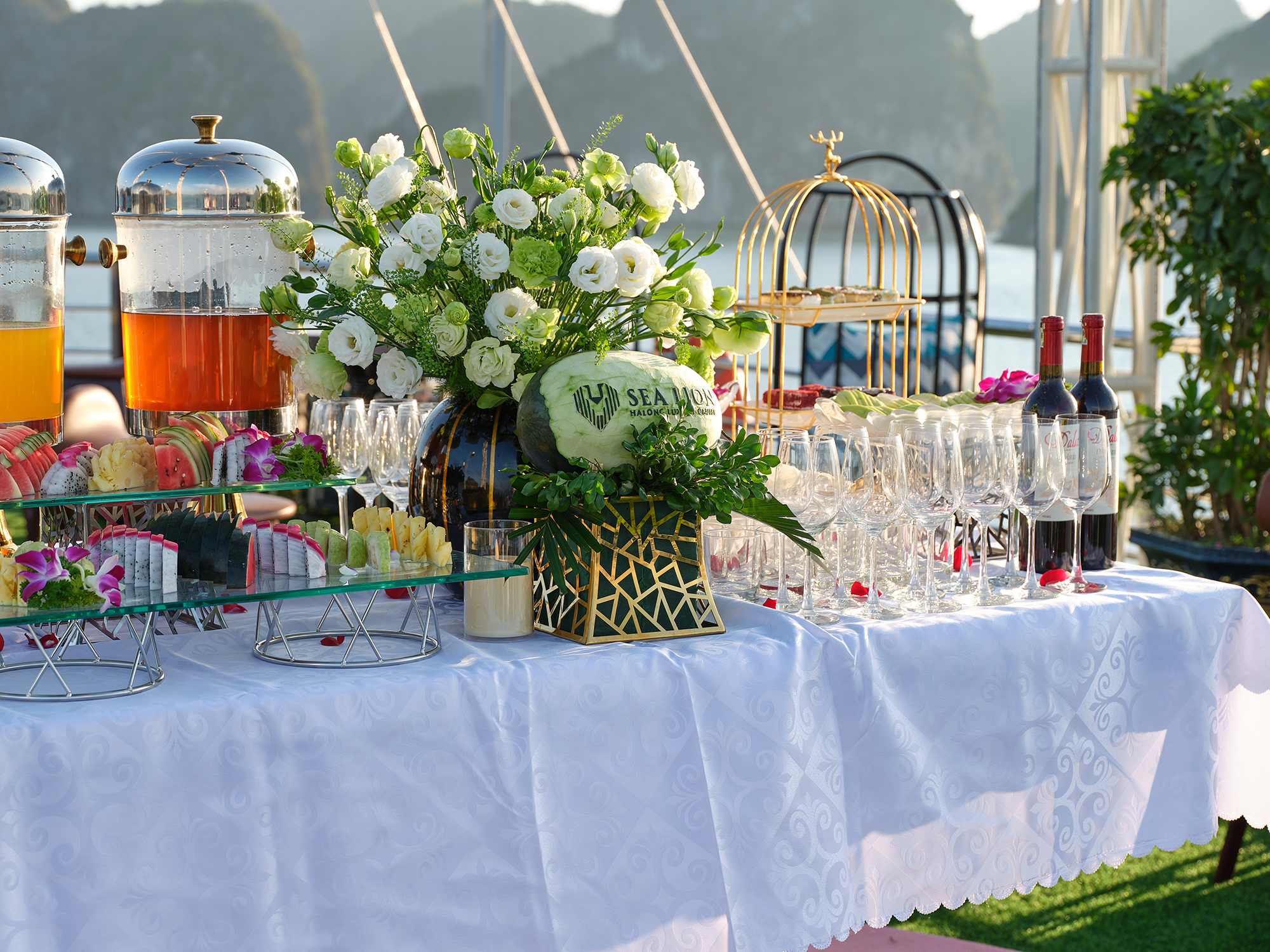 日落派对,提供葡萄酒、茶、水果、蛋糕等