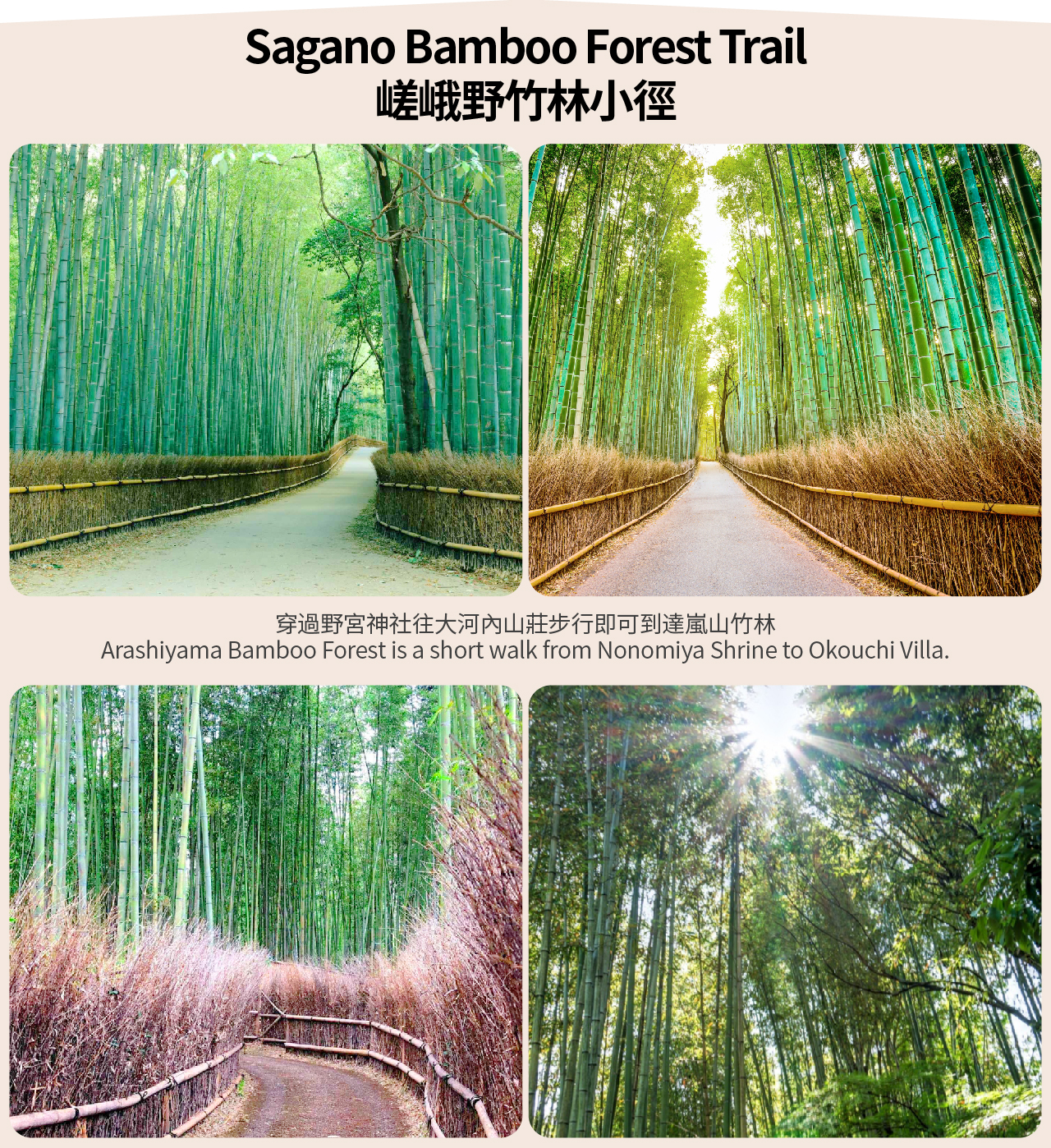 嵯峨野竹林小径长约500米,从竹林中穿过,可以听到风吹过竹叶发出的天籁之音,这一声音也被评为日本100种最值得保留的声音之一。小道内的天龙寺更是有着非常绝妙的日式庭园美景。