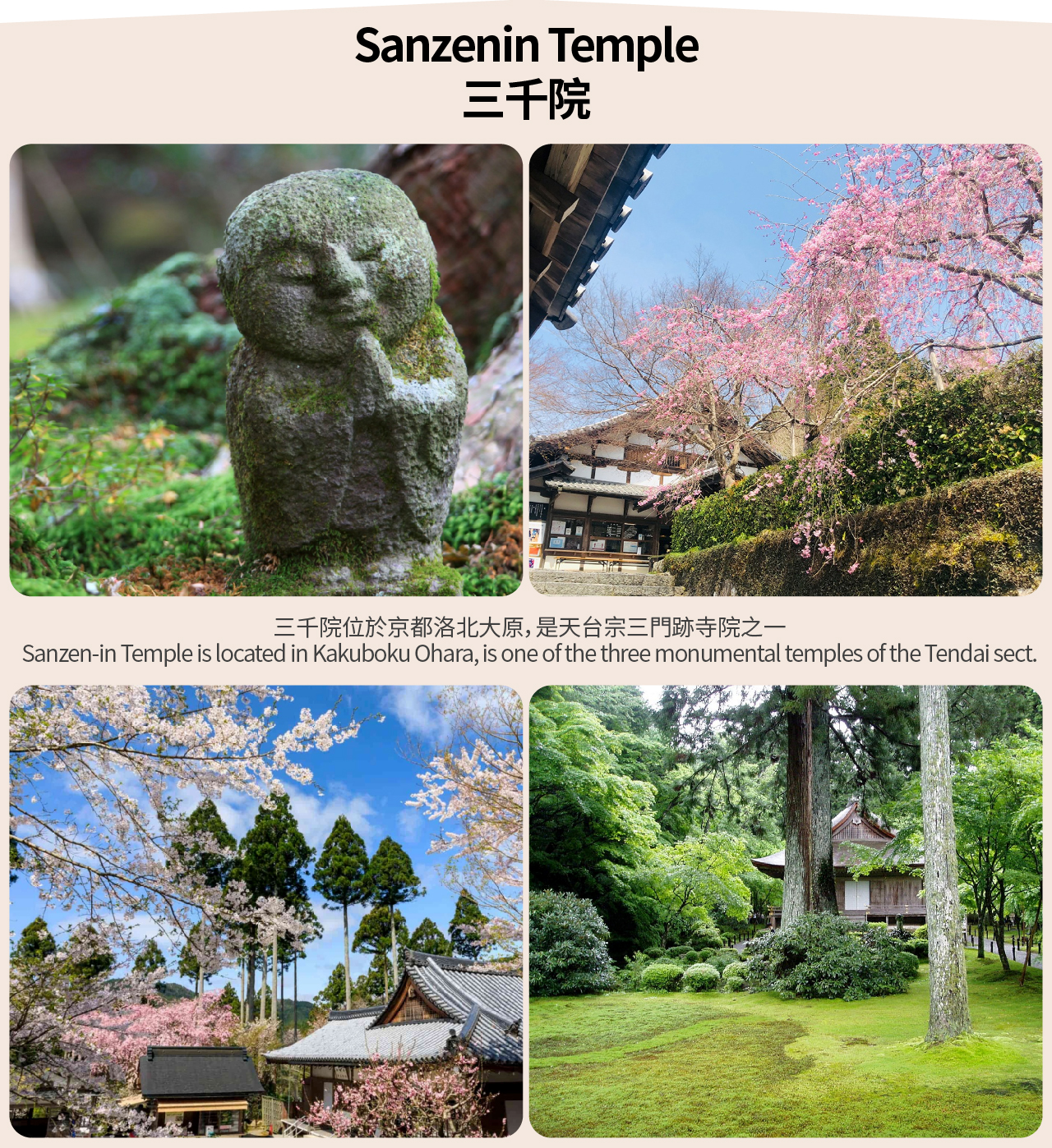 三千院位于京都洛北大原,是天台宗三门迹寺院之一。三千院辽阔的寺院内古树参天,青苔遍地,溪水潺潺,4月樱花、5月杜鹃花、7月紫阳花、秋季红叶,一年四季自然景致令人赏心悦目。