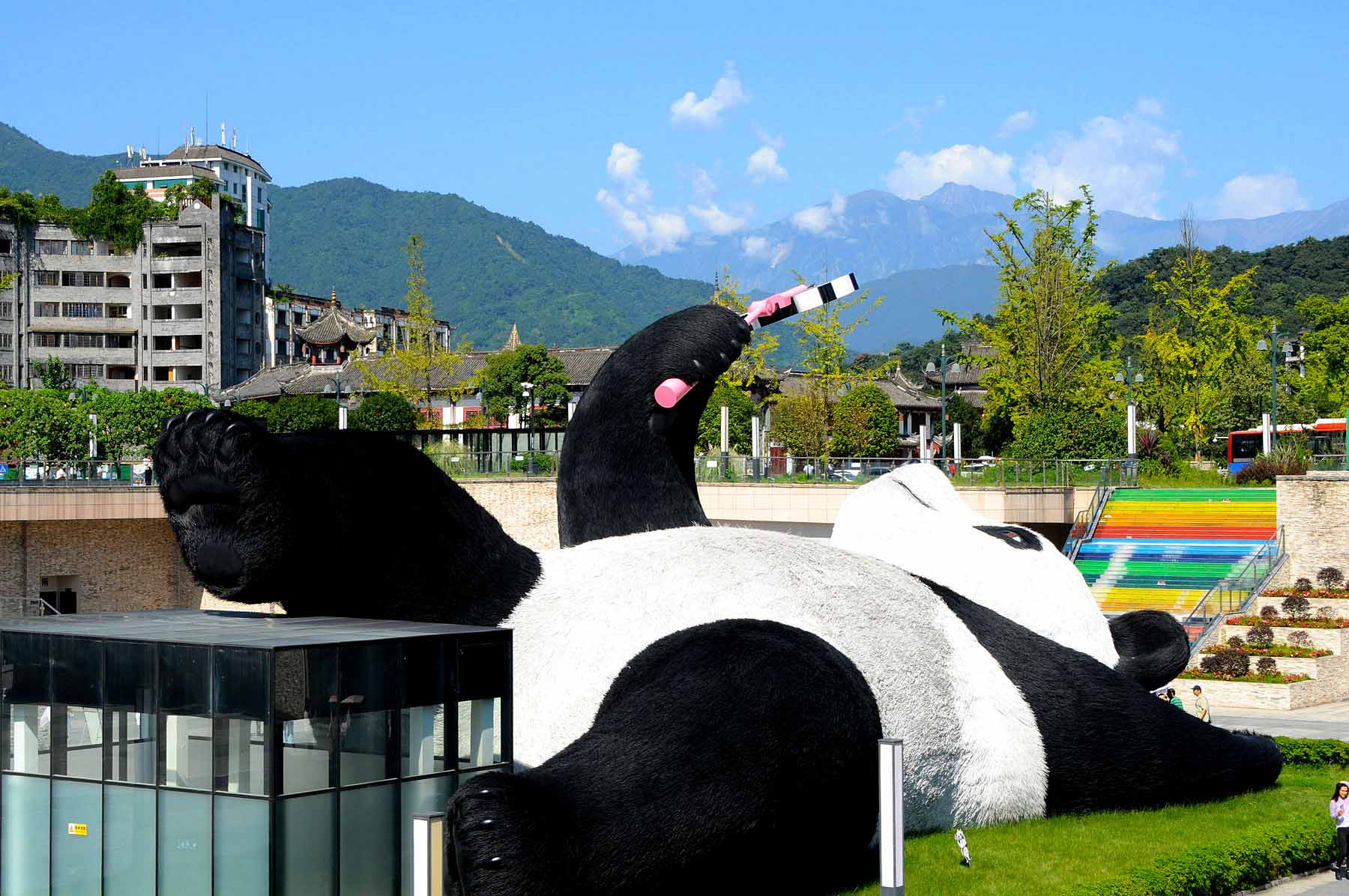 * 随后,前往仰天窝广场。这里不仅是一个休闲的好去处,更是大熊猫主题文化的聚集地。广场中央矗立着一只巨大的自拍熊猫雕塑,是都江堰的标志性建筑之一,非常适合拍照打卡。您可以与这只憨态可掬的大熊猫合影,留下难忘的瞬间。