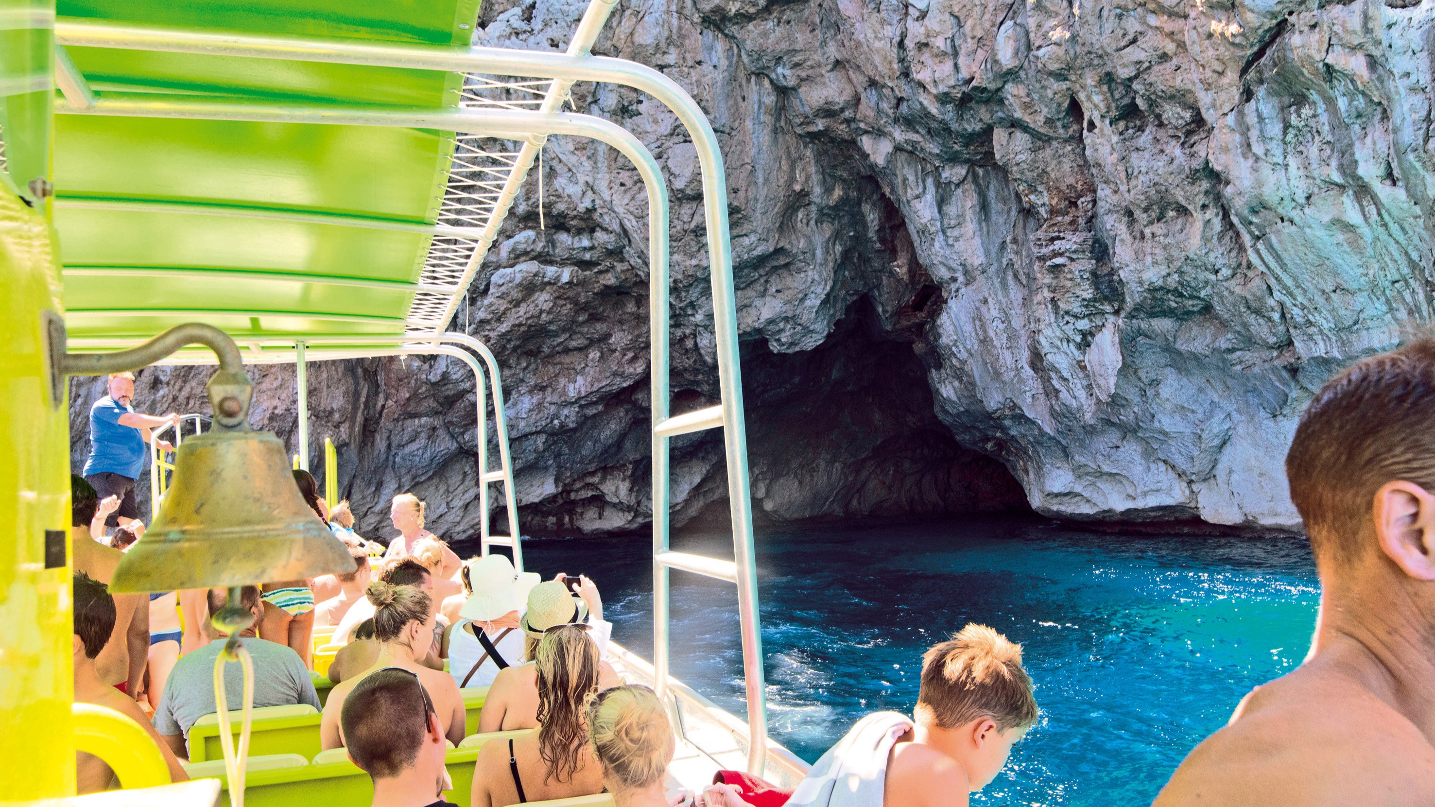 当船只驶过隐藏的洞穴入口时,参与者惊叹于崎岖的海岸线