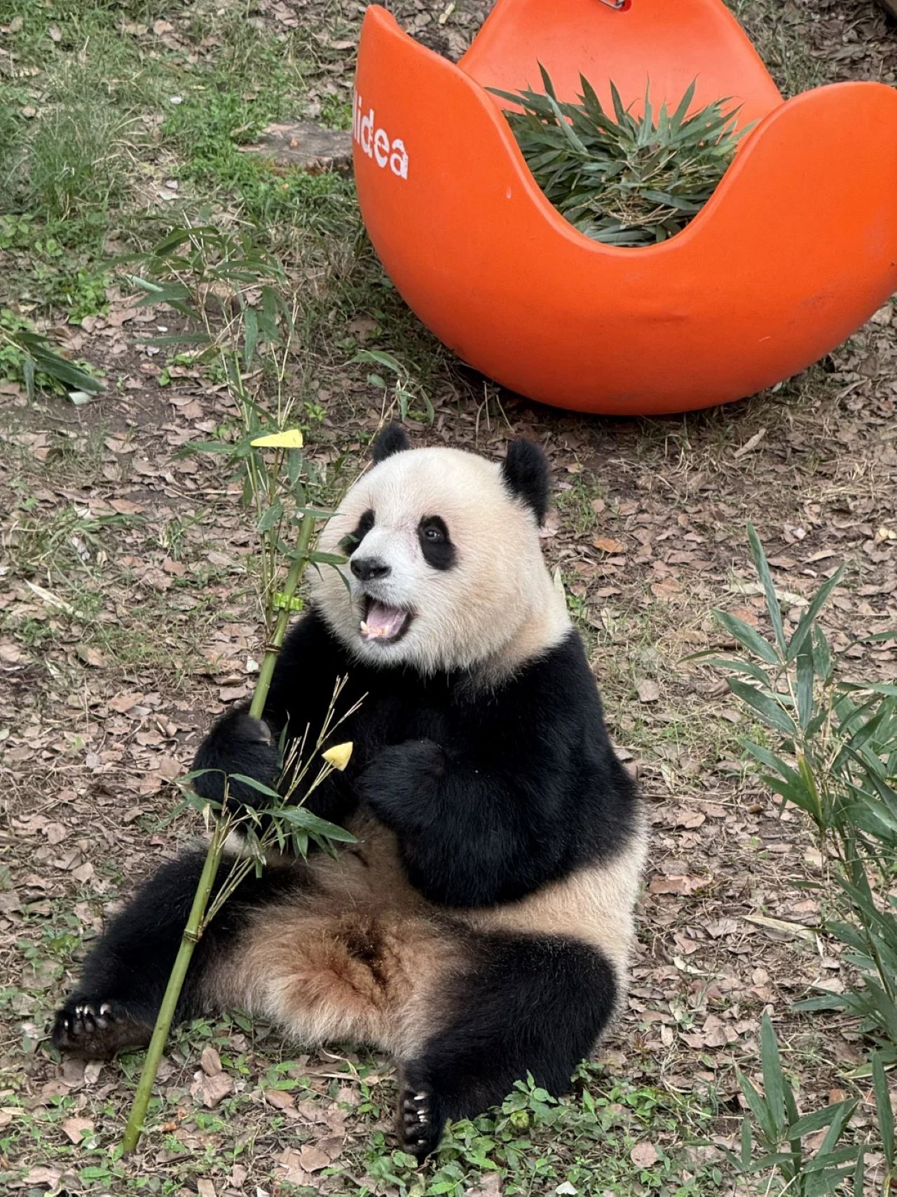 重庆动物园里看国宝熊猫吃饭、玩耍。