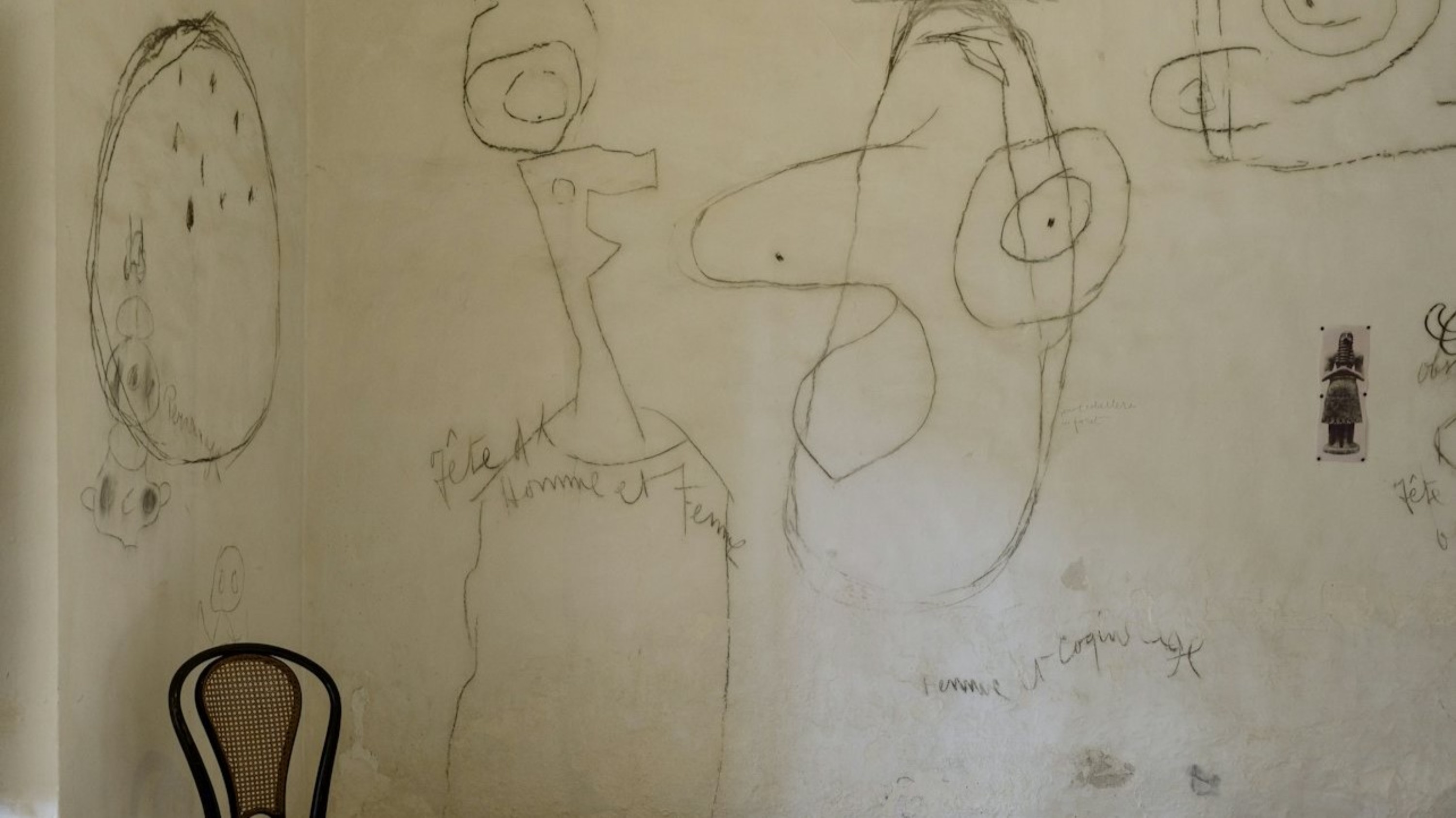 透过直接蚀刻在工作室墙壁上的草图和涂鸦来探索胡安·米罗的原始创造力!