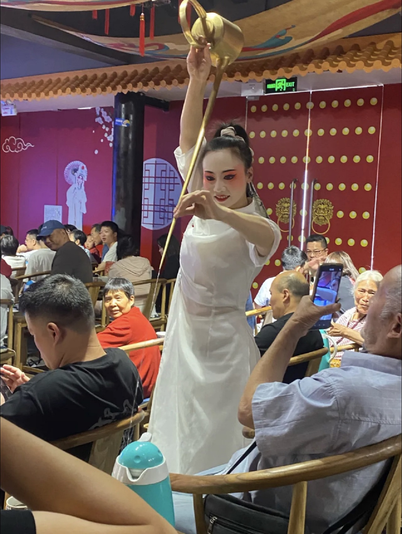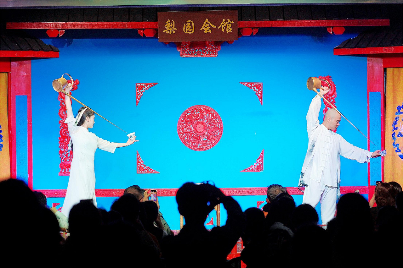 梨园会馆中有和观众互动的节目,长嘴壶功夫茶,让你在享受戏曲盛宴的同时,也能品尝到成都人的慢生活。
