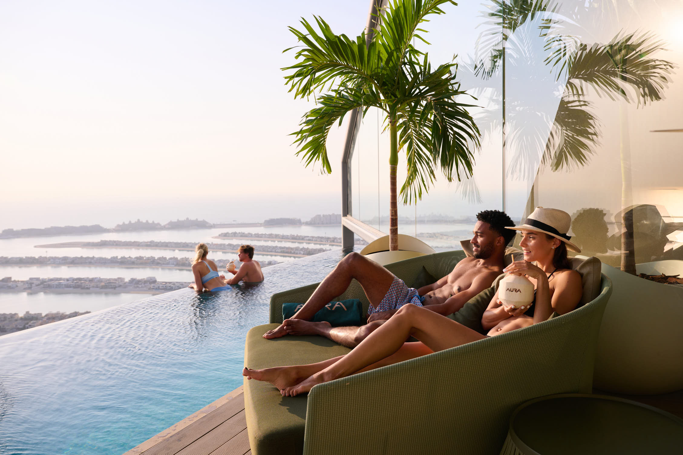 AURA 位于迪拜 210 米高处,是一处令人心醉神迷的世外桃源,在这里,您可以欣赏到城市天际线、朱美拉棕榈岛和阿拉伯湾的壮丽景色,每次光临都会有非凡的体验。AURA 将精致的餐饮、充满活力的氛围和宁静的休闲氛围融为一体,为您带来独特的体验。您可以尽情享用由行政主厨 Craig Best 精心制作的泛亚洲风味菜单,包括共享餐盘和池畔特色菜,让您尽享感官享受。从日出泳池体验到迷人的夜间泳池休闲区,客人可以在波光粼粼、恒温控制的绿洲中放松身心。AURA 夜间早午餐每周五晚上 8 点至 11 点供应套餐共享菜单和无限畅饮的饮品,并伴有现场 DJ 节拍,让您度过一个更美好的夜晚。无论您是庆祝、用餐还是放松,AURA 都将为您带来难忘的旅程,其美景同样令人难忘。