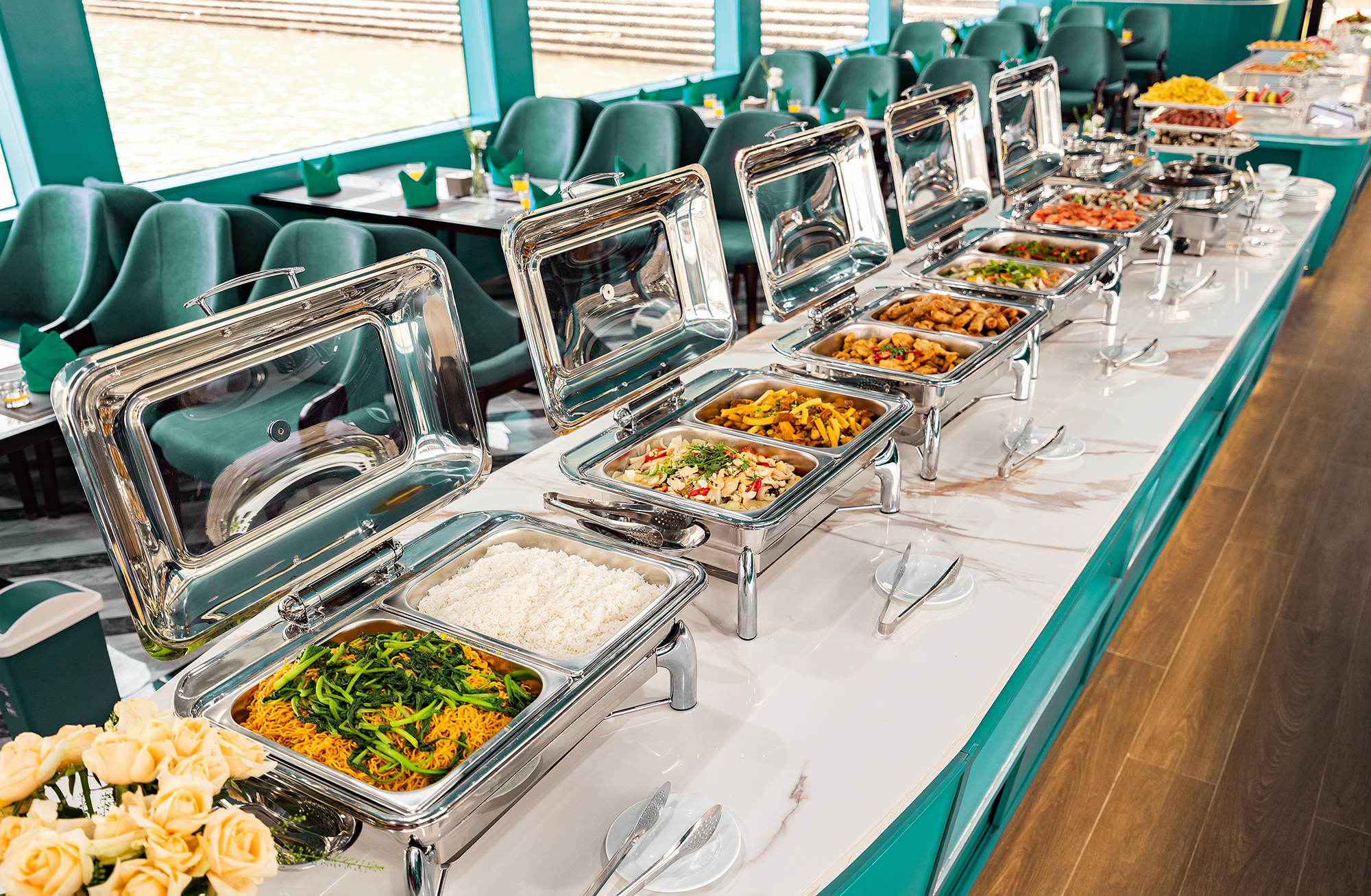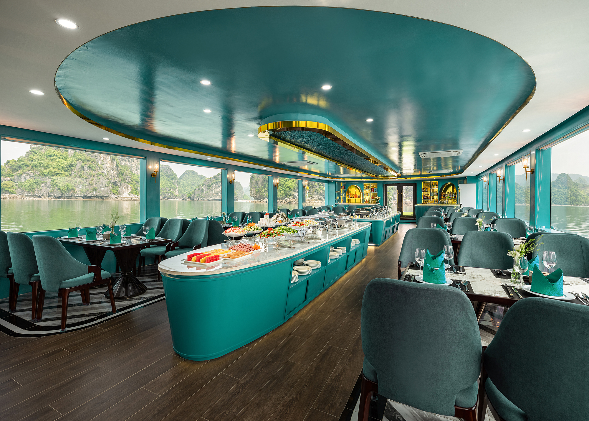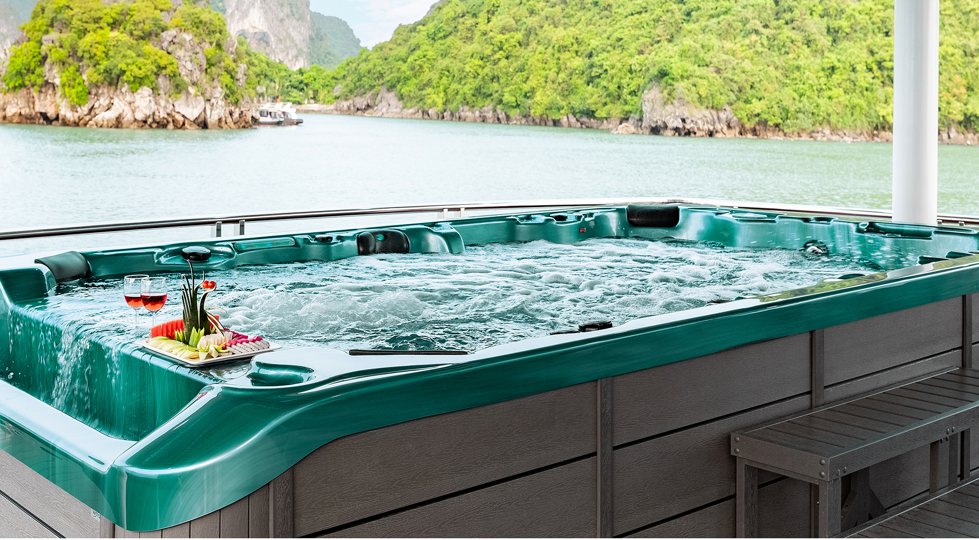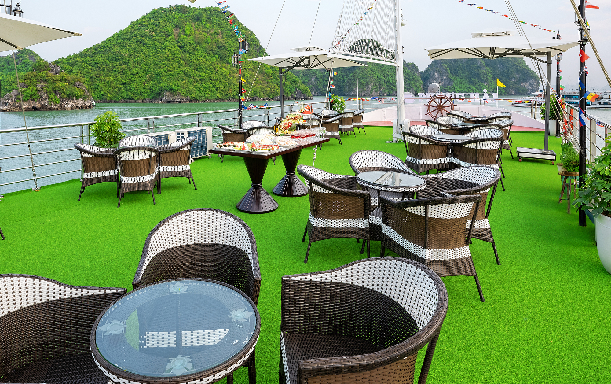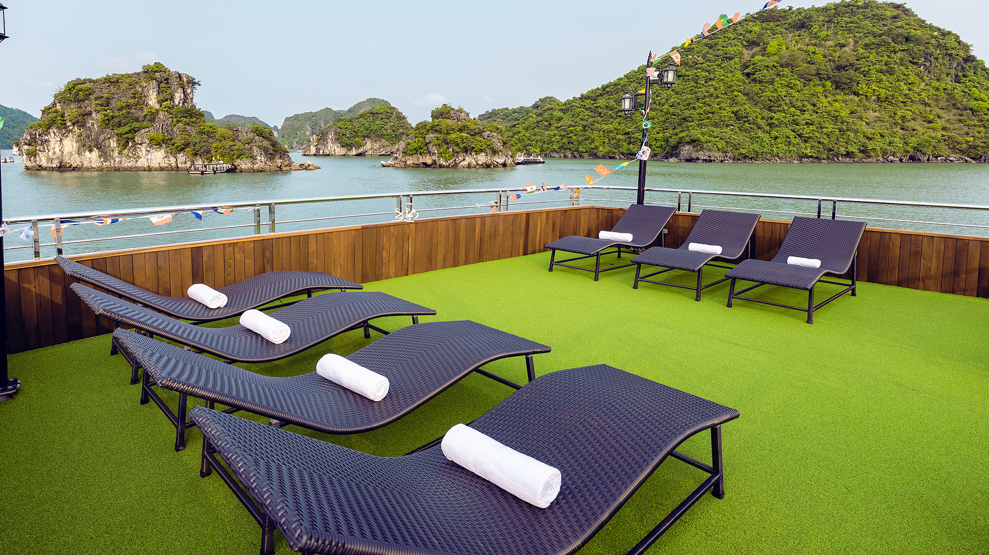 抵达团洲港后,乘船穿过碧绿的海水,欣赏岩石构造。在船上享用传统的越南午餐,沉浸在令人惊叹的环境中。继续您的探索之旅,参观著名的 Sung Sot 洞穴,也被称为“惊喜洞”。欣赏闪闪发光的钟乳石,它们呈现出无数独特的形状。乘坐皮划艇或竹船在水中度过一段时间,探索令人惊叹的 Luon 洞穴。经过 Titop 岛时,感受阳光的温暖。在水中畅游一番,或徒步前往 Titop 山顶,欣赏海湾的全景。之后,放松一会儿,然后返回船上参加日落派对,享用红酒、炸薯条和水果。