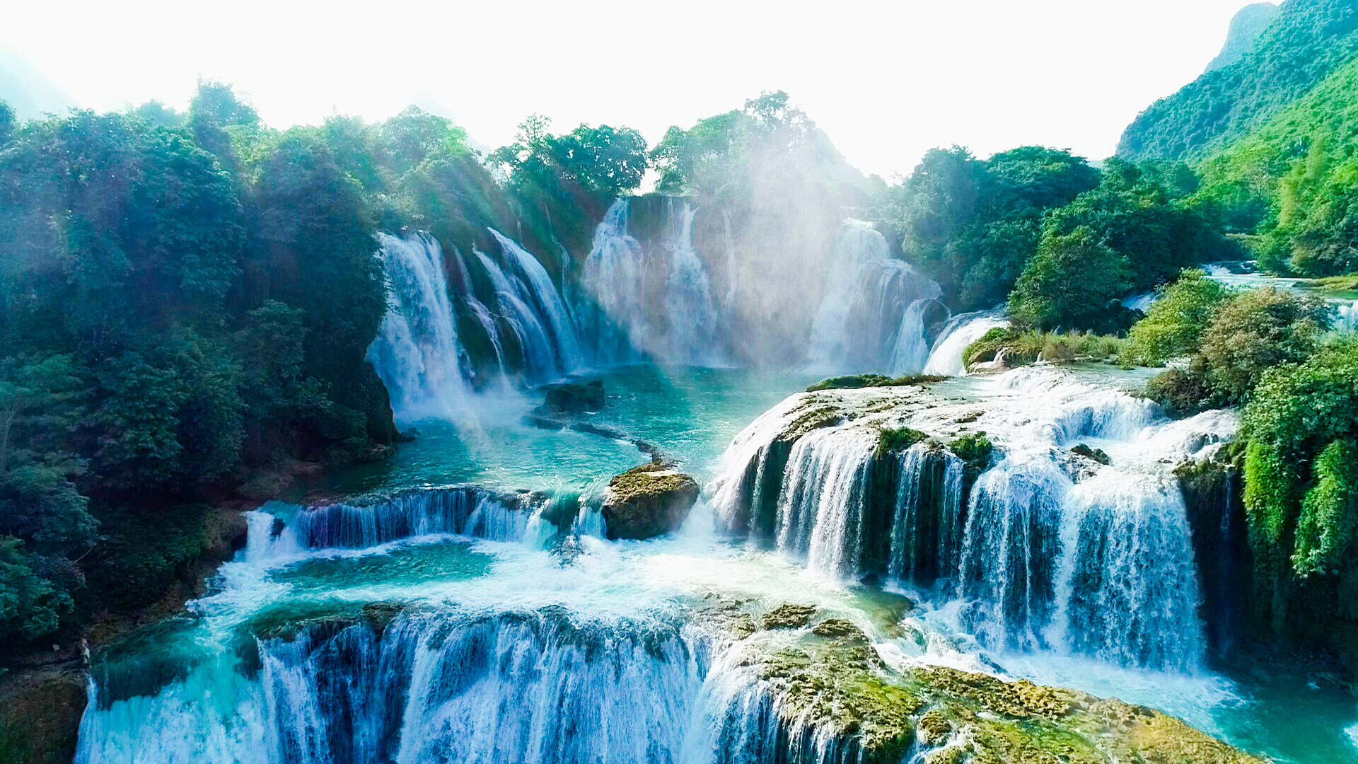 * 德天跨国瀑布:德天跨国瀑布雄奇壮观,横跨中越两国。瀑布从层峦叠嶂的石崖上倾泻而下,水流湍急,气势磅礴。与越南板约瀑布相连,景色秀丽。周围青山绿水,翠竹摇曳,独特的跨国风情与自然美景相互交融,吸引着无数游客。